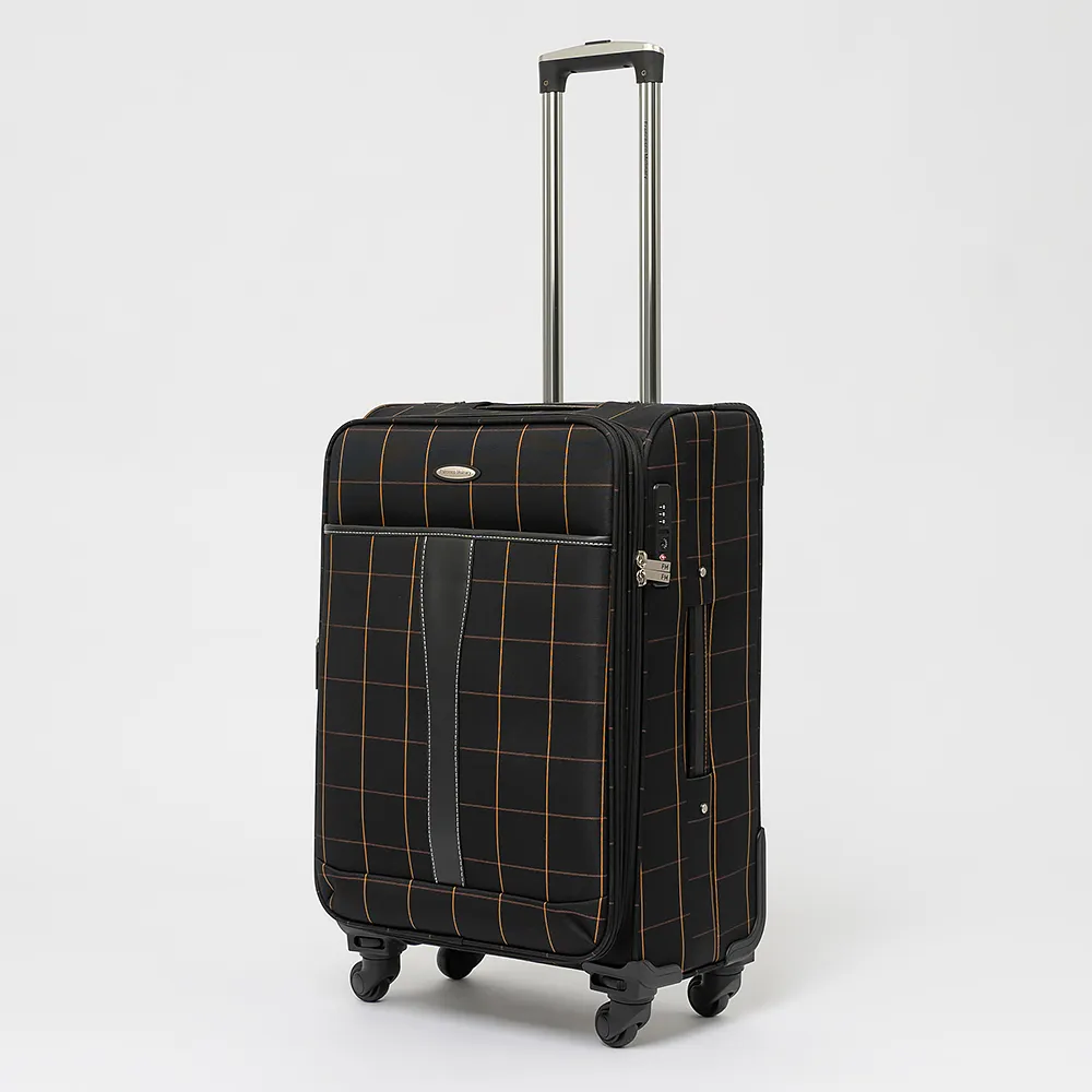 Чемодан-спиннер от бренда Francesco Molinary выполнен из плотного текстильного материала черного цвета в клетку. Декорирован вставками из искусственной кожи с контрастной отстрочкой. Модель на четырех съемных пластиковых колесах, с выдвижной металлической ручкой, ручками сверху и сбоку, пластиковыми ножками-опорами сбоку. Закрывается двойной антивандальной молнией, имеется кодовый замок TSA. Внутри: фирменная подкладка, на крышке - карман-сетка на молнии, в глубоком отделении - фиксирующие ремни для багажа. Имеется раздвижка на молнии для увеличения объема. На лицевой стороне - карман на молнии, на задней - адресная бирка.