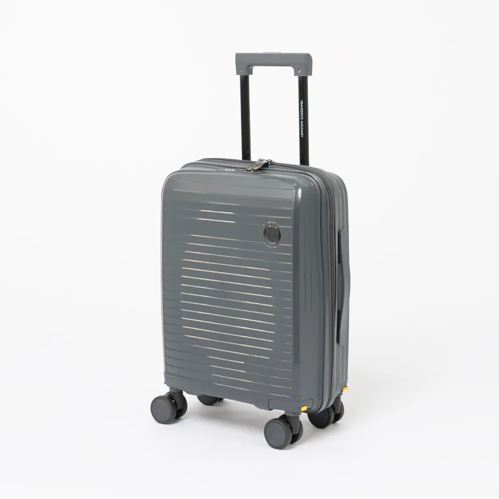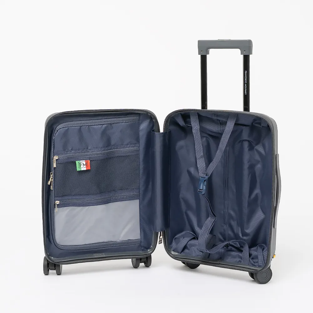 Чемодан-спиннер от торговой марки Francesco Molinary из ударопрочного термостойкого полипропилена с рельефными полосами в сером цвете. Модель на четырех сдвоенных пластиковых колесах, с выдвижной телескопической ручкой, прорезиненной ручкой сверху. Закрывается двойной антивандальной молнией антивор, имеется кодовый замок. Внутри: фирменная подкладка плотностью 210 Ден, в одной части - клапан-разделитель на молнии, водонепроницаемый карман, в другой - перекрестные фиксирующие ремни для багажа. На лицевой стороне - функциональный карман на молнии с двумя встречными бегунками, раскрытие регулируется вытачками на липучках. Внутри: накладной карман с уплотненной стенкой для ноутбука, два накладных кармана, карман-сетка на молнии.