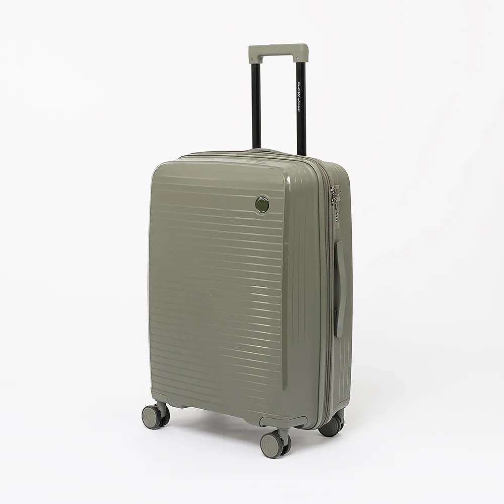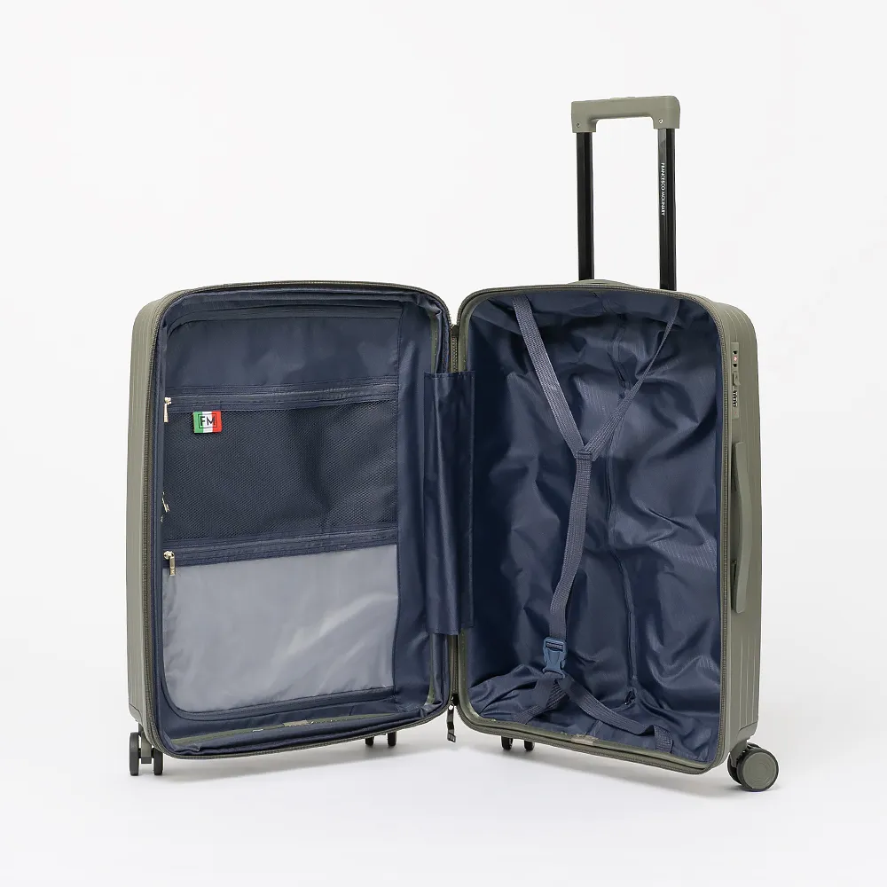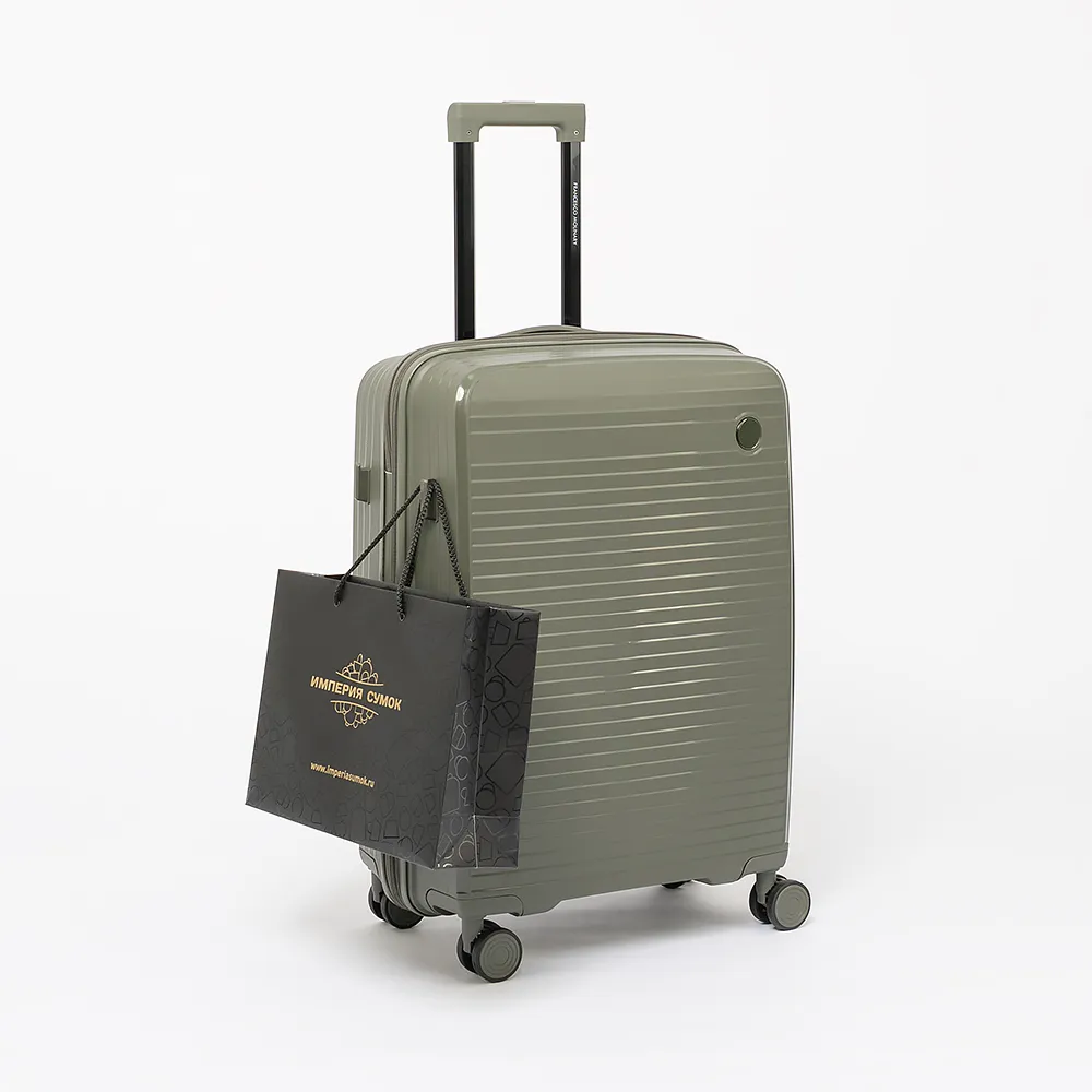 Чемодан-спиннер от торговой марки Francesco Molinary из ударопрочного термостойкого полипропилена с рельефными полосами в сером цвете. Модель на четырех сдвоенных пластиковых колесах, с выдвижной телескопической ручкой, прорезиненной ручкой сверху. Закрывается двойной антивандальной молнией антивор, имеется кодовый замок. Внутри: фирменная подкладка плотностью 210 Ден, в одной части - клапан-разделитель на молнии, водонепроницаемый карман, в другой - перекрестные фиксирующие ремни для багажа. На лицевой стороне - функциональный карман на молнии с двумя встречными бегунками, раскрытие регулируется вытачками на липучках. Внутри: накладной карман с уплотненной стенкой для ноутбука, два накладных кармана, карман-сетка на молнии.
