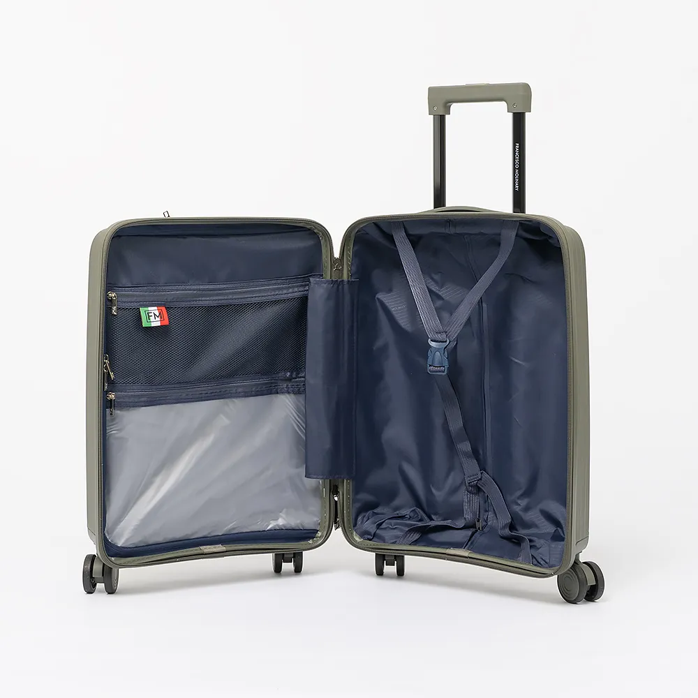 Чемодан-спиннер от торговой марки Francesco Molinary из ударопрочного термостойкого полипропилена с рельефными полосами в сером цвете. Модель на четырех сдвоенных пластиковых колесах, с выдвижной телескопической ручкой, прорезиненной ручкой сверху. Закрывается двойной антивандальной молнией антивор, имеется кодовый замок. Внутри: фирменная подкладка плотностью 210 Ден, в одной части - клапан-разделитель на молнии, водонепроницаемый карман, в другой - перекрестные фиксирующие ремни для багажа. На лицевой стороне - функциональный карман на молнии с двумя встречными бегунками, раскрытие регулируется вытачками на липучках. Внутри: накладной карман с уплотненной стенкой для ноутбука, два накладных кармана, карман-сетка на молнии.