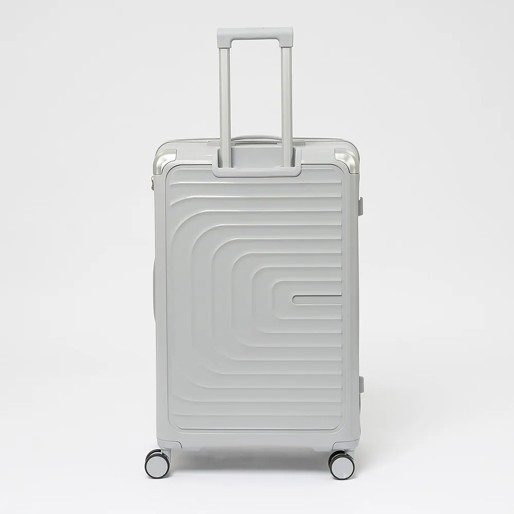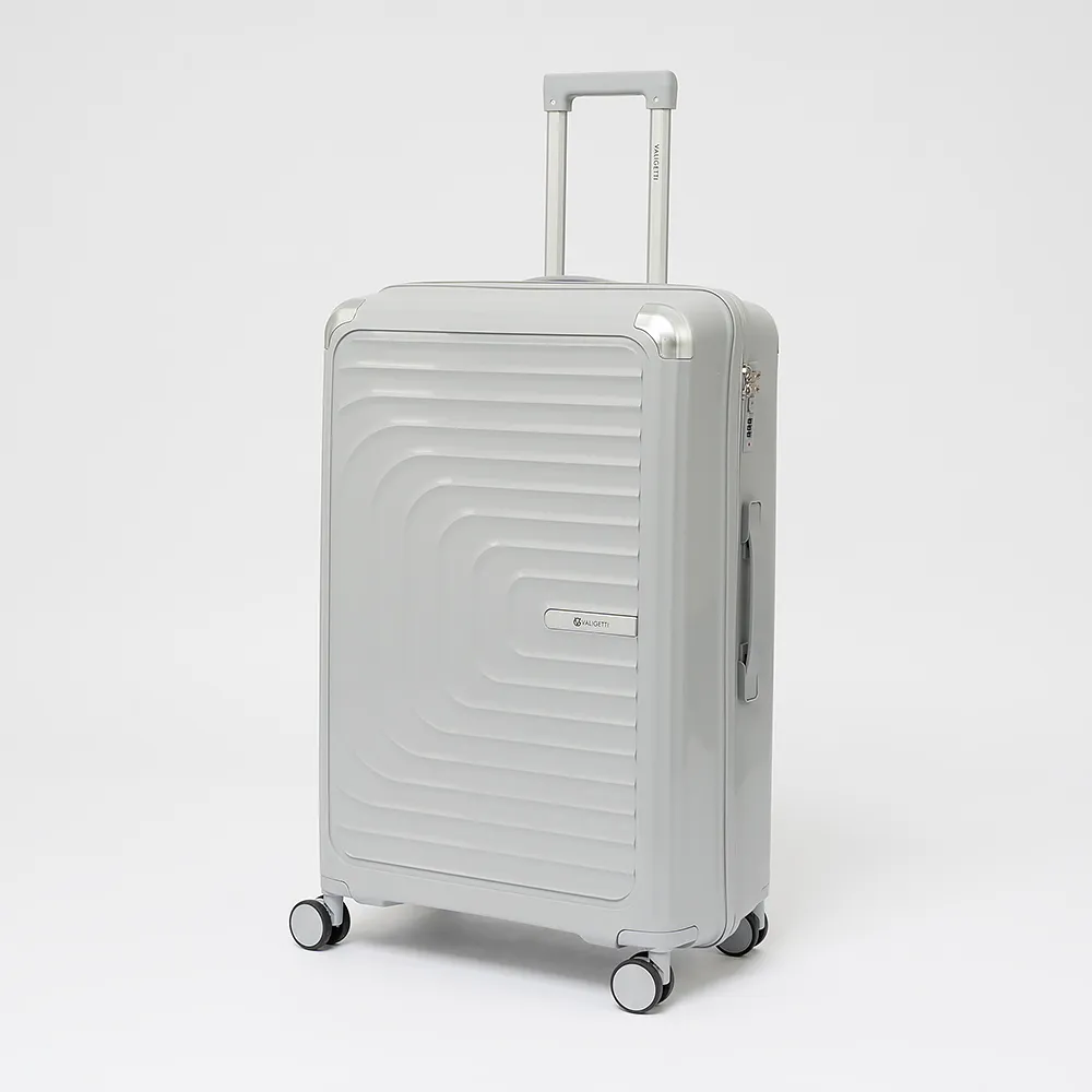 Чемодан-спиннер от торговой марки Valigetti из ударопрочного термостойкого полипропилена серебристого цвета. Модель на четырех пластиковых колесах, с выдвижной ручкой и ручкой-переноской сверху, ножками для защиты от износа с крючками для подвешивания. Имеется утопленный кодовый замок. Отделение на молнии с двумя встречными бегунками. Внутри: фирменная подкладка. В одном отделении - разделитель на молнии и карман-сетка на молнии, в другом - перекрестные ремни для фиксации багажа.