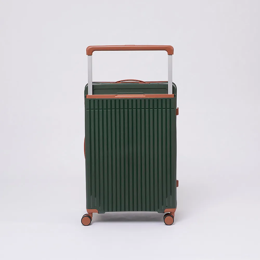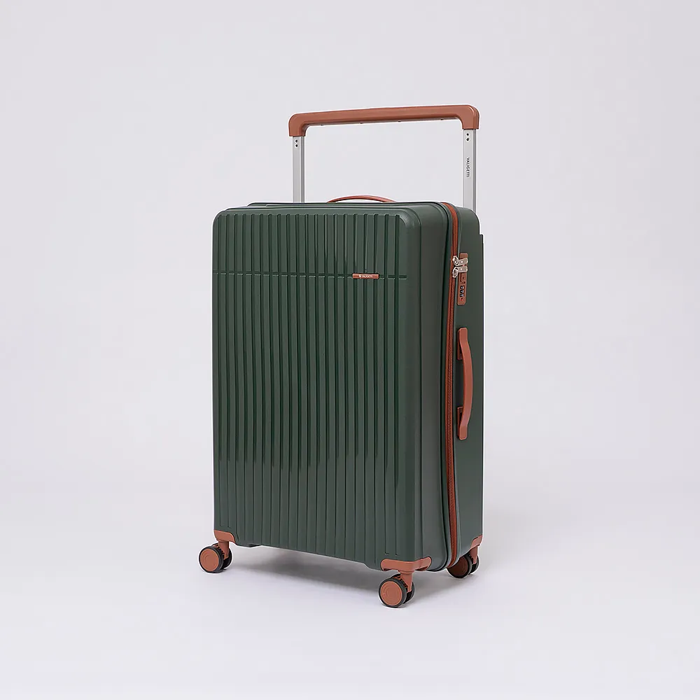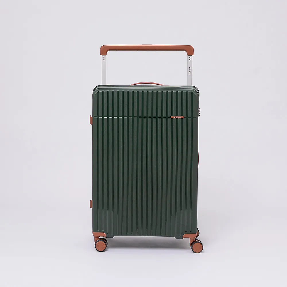 Чемодан-спиннер от торговой марки Valigetti выполнен из ударопрочного термостойкого полипропилена с антивандальной рельефной поверхностью зеленого цвета с коричневыми элементами. Модель на четырех сдвоенных пластиковых колесах, с широкой телескопической ручкой, ручкой-переноской сверху и сбоку, пластиковыми ножками для защиты от износа. Закрывается молнией №8 антивор, имеется кодовый замок, утопленный в корпус. Внутри: фирменная подкладка, в одной части - перекрестные ремни для фиксации багажа, в другой - клапан-разделитель на молнии, карман-сетка на молнии. Верхние ножки выполнены в виде крючков для подвешивания.