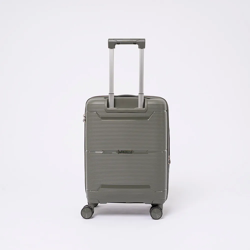 Чемодан-спиннер от торговой марки Francesco Molinary из ударопрочного полипропилена с рельефной антивандальной поверхностью цвета хаки. Модель на четырех сдвоенных колесах, с выдвижной ручкой с кнопкой и железными трубками, ручкой-переноской сверху. Закрывается молнией №8 антивор, имеется кодовый замок TSA с USB входом. Внутри: фирменная подкладка, в одной части - клапан-разделитель на молнии, карман-сетка на молнии и водонепроницаемый карман, в другой части - перекрестные ремни для фиксации багажа. На выдвижной ручке предусмотрена откидная подставка для телефона и крючки подвешивания пакетов.
