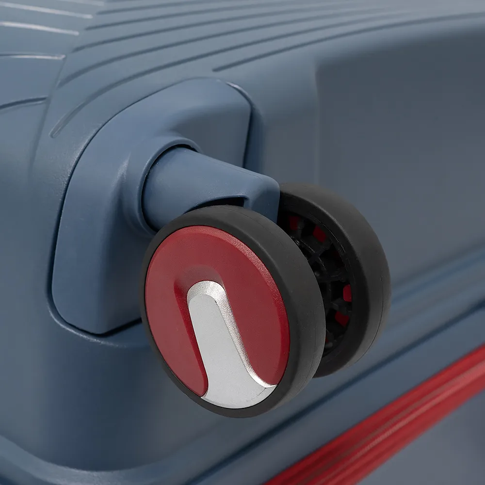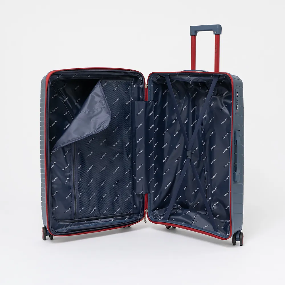 Чемодан-спиннер от торговой марки Valigetti из ударопрочного термостойкого полипропилена с рельефной антивандальной поверхностью синего цвета с красными элементами. Модель на четырех сдвоенных колесах с прорезиненной накладкой, обеспечивающей бесшумный плавный ход, с выдвижной ручкой с кнопкой и железными трубками, ручками-переносками сверху и сбоку, пластиковыми ножками-опорами сбоку. Закрывается молнией, имеется кодовый замок и раздвижка на молнии для увеличения объема. Внутри: фирменная подкладка, в одной части - клапан-разделитель на молнии, карман-сетка на молнии, в другой части - перекрестные ремни для фиксации багажа. На боковых ножках имеются крючки для подвешивания пакетов.