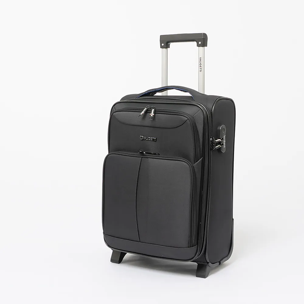 Чемодан от торговой марки Valiggetti из прочного практичного текстильного материала серого цвета. Модель на двух пластиковых колесах, с выдвижной ручкой, ручкой-переноской сверху и сбоку, пластиковыми ножками-опорами снизу и сбоку, держателем на дне. Закрывается молнией, имеется кодовый замок. Внутри: фирменная подкладка, на крышке - карман-сетка на молнии, в глубоком отделении - ремни для фиксации багажа. На лицевой стороне - два кармана на молнии.