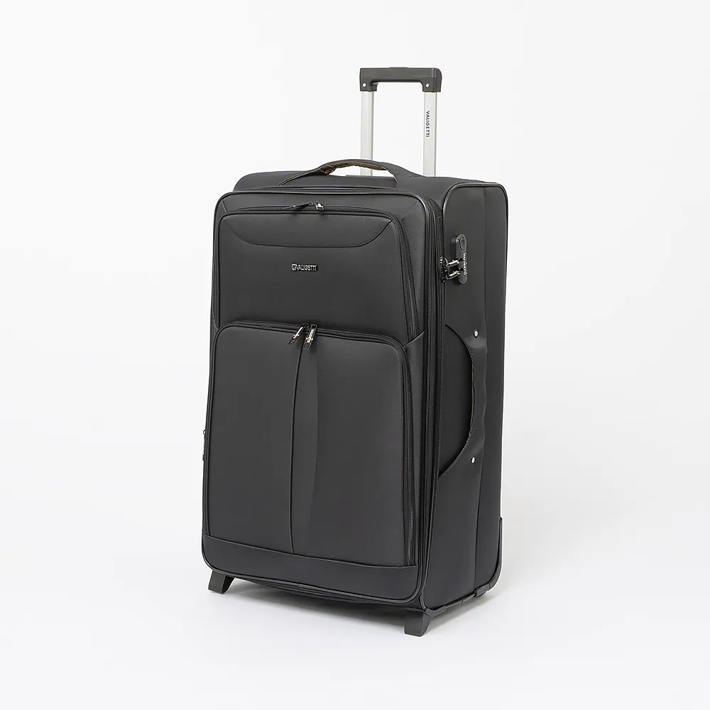 Чемодан от торговой марки Valiggetti из прочного практичного текстильного материала серого цвета. Модель на двух пластиковых колесах, с выдвижной ручкой, ручкой-переноской сверху и сбоку, пластиковыми ножками-опорами снизу и сбоку, держателем на дне. Закрывается молнией, имеется кодовый замок. Внутри: фирменная подкладка, на крышке - карман-сетка на молнии, в глубоком отделении - ремни для фиксации багажа. На лицевой стороне - два кармана на молнии.