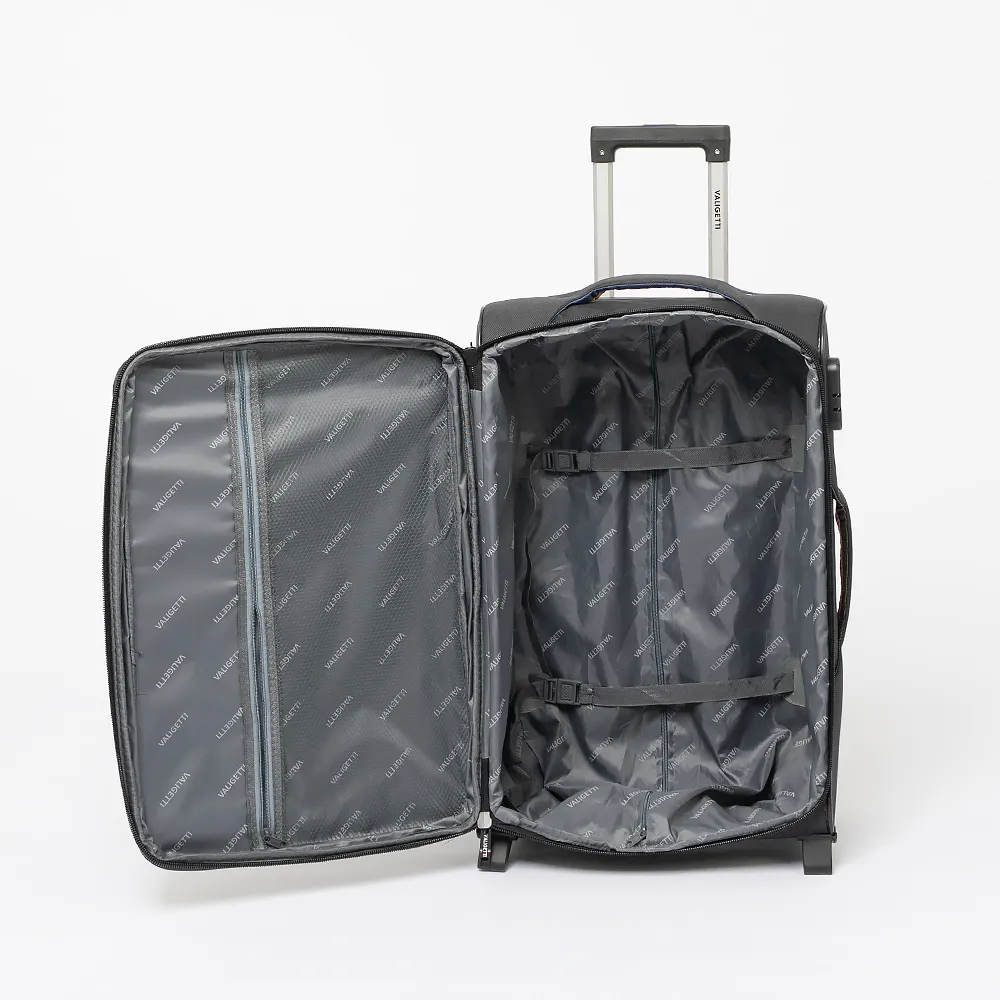 Чемодан от торговой марки Valiggetti из прочного практичного текстильного материала серого цвета. Модель на двух пластиковых колесах, с выдвижной ручкой, ручкой-переноской сверху и сбоку, пластиковыми ножками-опорами снизу и сбоку, держателем на дне. Закрывается молнией, имеется кодовый замок. Внутри: фирменная подкладка, на крышке - карман-сетка на молнии, в глубоком отделении - ремни для фиксации багажа. На лицевой стороне - два кармана на молнии.