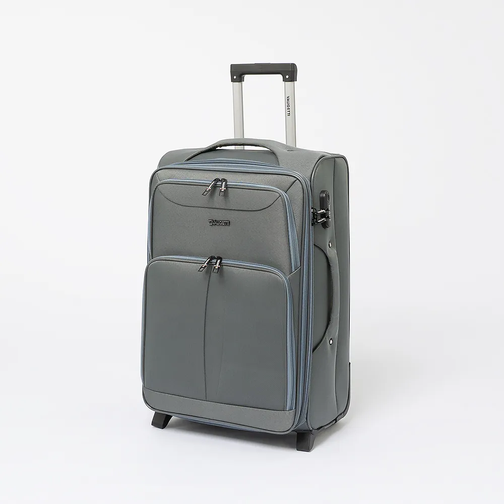 Чемодан от торговой марки Valiggetti из прочного практичного текстильного материала серого цвета. Модель на двух пластиковых колесах, с выдвижной ручкой, ручкой-переноской сверху и сбоку, пластиковыми ножками-опорами снизу и сбоку, держателем на дне. Закрывается молнией, имеется кодовый замок. Внутри: фирменная подкладка, на крышке - карман-сетка на молнии, в глубоком отделении - ремни для фиксации багажа. На лицевой стороне - два кармана на молнии.