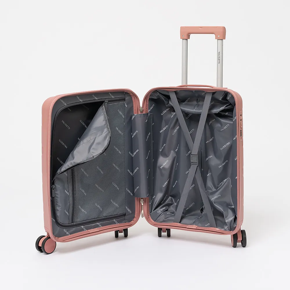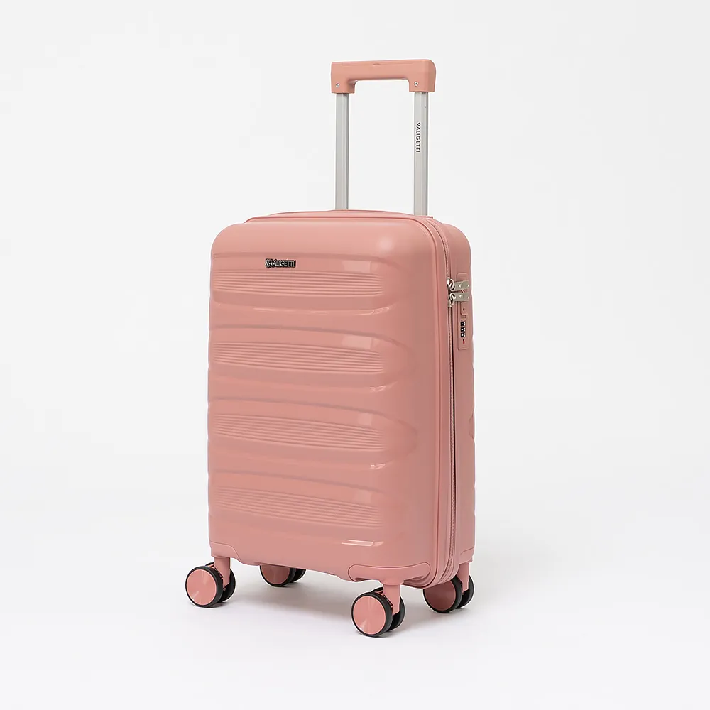 Чемодан-спиннер от торговой марки Valigetti из ударопрочного термостойкого полипропилена с рельефной антивандальной поверхностью бежевого цвета с коричневыми элементами. Модель на четырех сдвоенных колесах, с выдвижной ручкой, ручками-переносками сверху и сбоку, пластиковыми ножками сбоку для защиты от износа. Закрывается молнией №8 антивор, имеется кодовый замок, утопленный в корпус. Внутри: фирменная подкладка, в одной части - клапан-разделитель на молнии, карман-сетка на молнии, в другой части - перекрестные ремни для фиксации багажа. На верхних боковых ножках предусмотрены крючки для подвешивания пакетов.