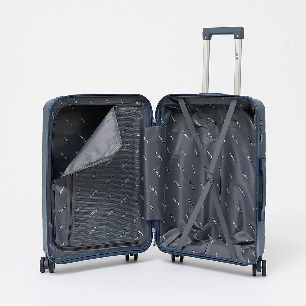 Чемодан-спиннер от торговой марки Valigetti из ударопрочного термостойкого полипропилена с рельефной антивандальной поверхностью бежевого цвета с коричневыми элементами. Модель на четырех сдвоенных колесах, с выдвижной ручкой, ручками-переносками сверху и сбоку, пластиковыми ножками сбоку для защиты от износа. Закрывается молнией №8 антивор, имеется кодовый замок, утопленный в корпус. Внутри: фирменная подкладка, в одной части - клапан-разделитель на молнии, карман-сетка на молнии, в другой части - перекрестные ремни для фиксации багажа. На верхних боковых ножках предусмотрены крючки для подвешивания пакетов.
