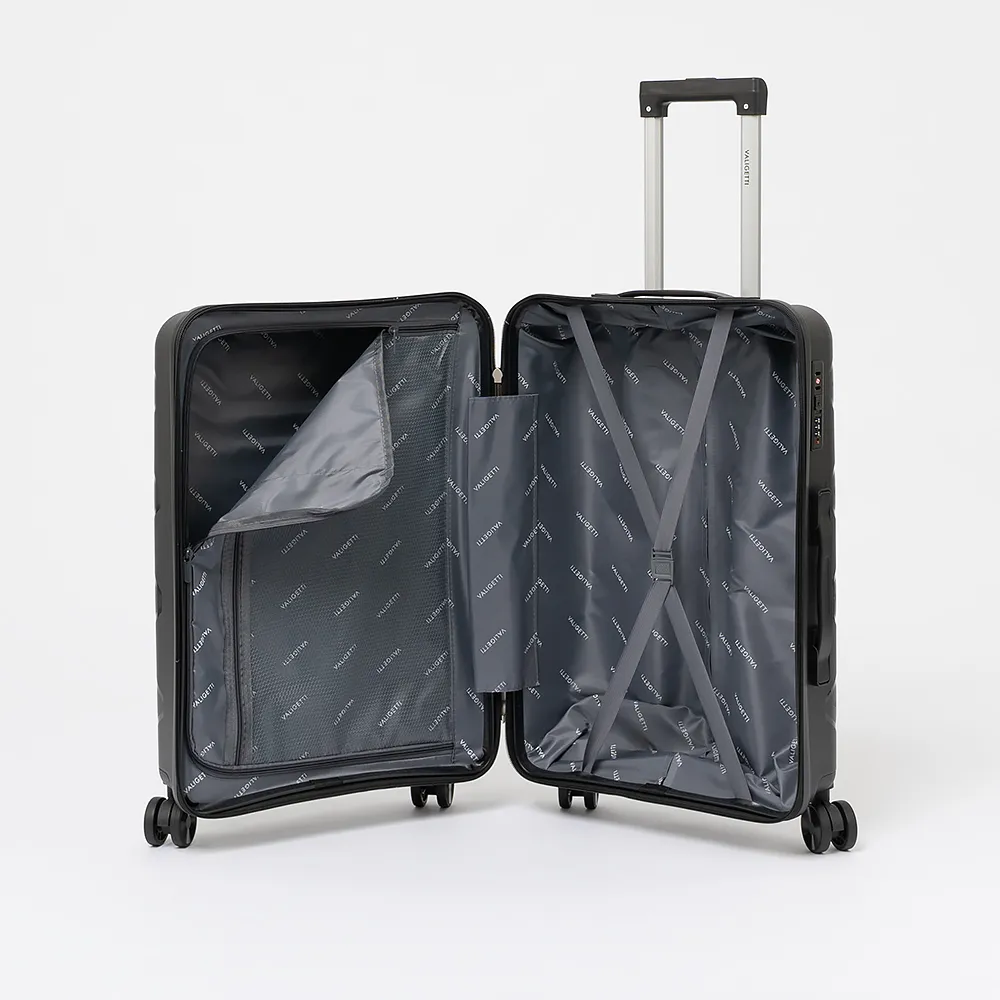 Чемодан-спиннер от торговой марки Valigetti из ударопрочного термостойкого полипропилена с рельефной антивандальной поверхностью бежевого цвета с коричневыми элементами. Модель на четырех сдвоенных колесах, с выдвижной ручкой, ручками-переносками сверху и сбоку, пластиковыми ножками сбоку для защиты от износа. Закрывается молнией №8 антивор, имеется кодовый замок, утопленный в корпус. Внутри: фирменная подкладка, в одной части - клапан-разделитель на молнии, карман-сетка на молнии, в другой части - перекрестные ремни для фиксации багажа. На верхних боковых ножках предусмотрены крючки для подвешивания пакетов.