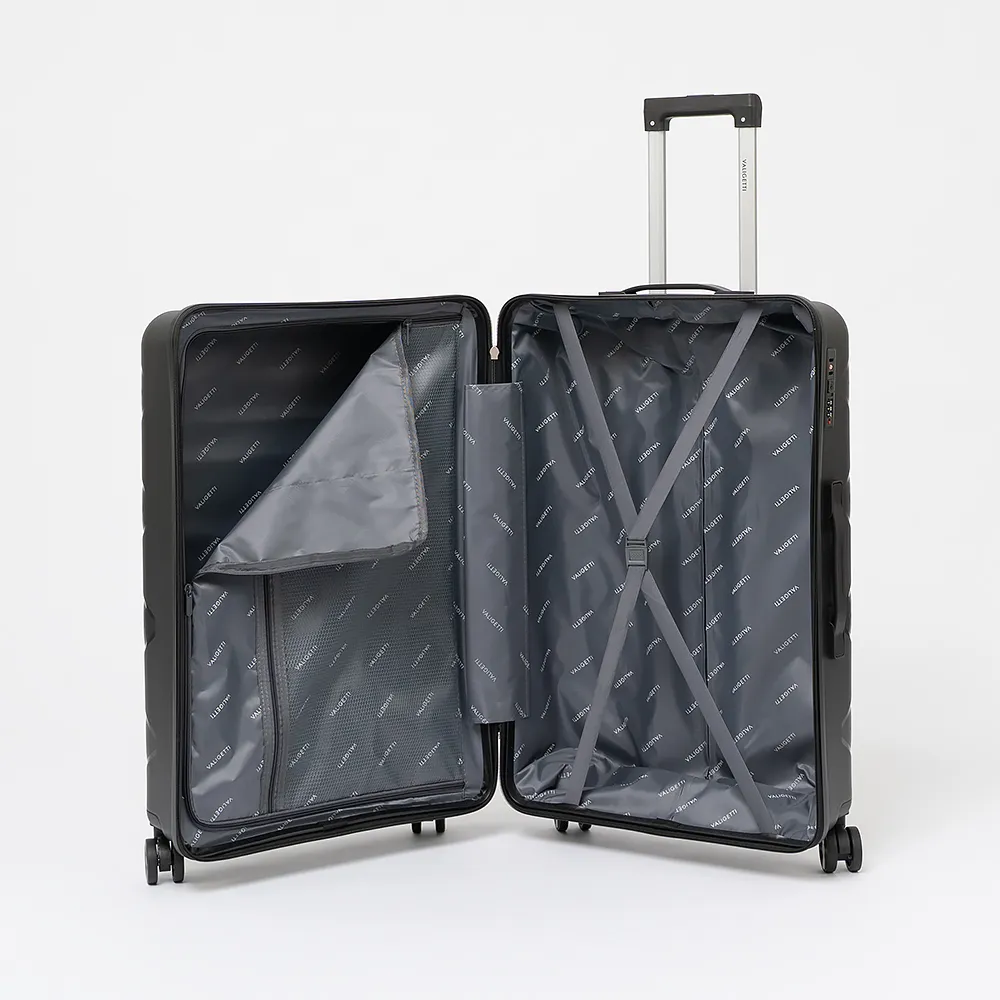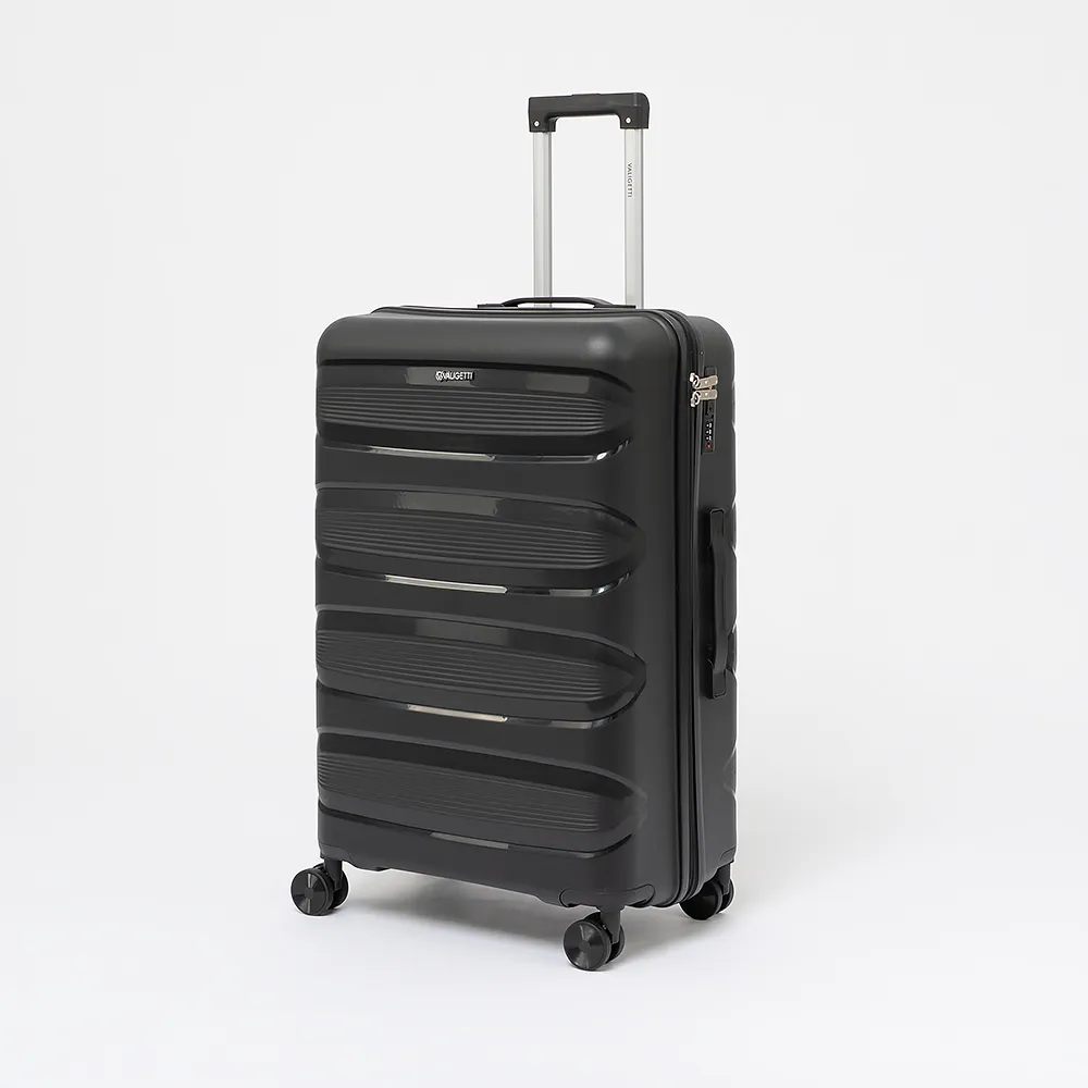 Чемодан-спиннер от торговой марки Valigetti из ударопрочного термостойкого полипропилена с рельефной антивандальной поверхностью бежевого цвета с коричневыми элементами. Модель на четырех сдвоенных колесах, с выдвижной ручкой, ручками-переносками сверху и сбоку, пластиковыми ножками сбоку для защиты от износа. Закрывается молнией №8 антивор, имеется кодовый замок, утопленный в корпус. Внутри: фирменная подкладка, в одной части - клапан-разделитель на молнии, карман-сетка на молнии, в другой части - перекрестные ремни для фиксации багажа. На верхних боковых ножках предусмотрены крючки для подвешивания пакетов.