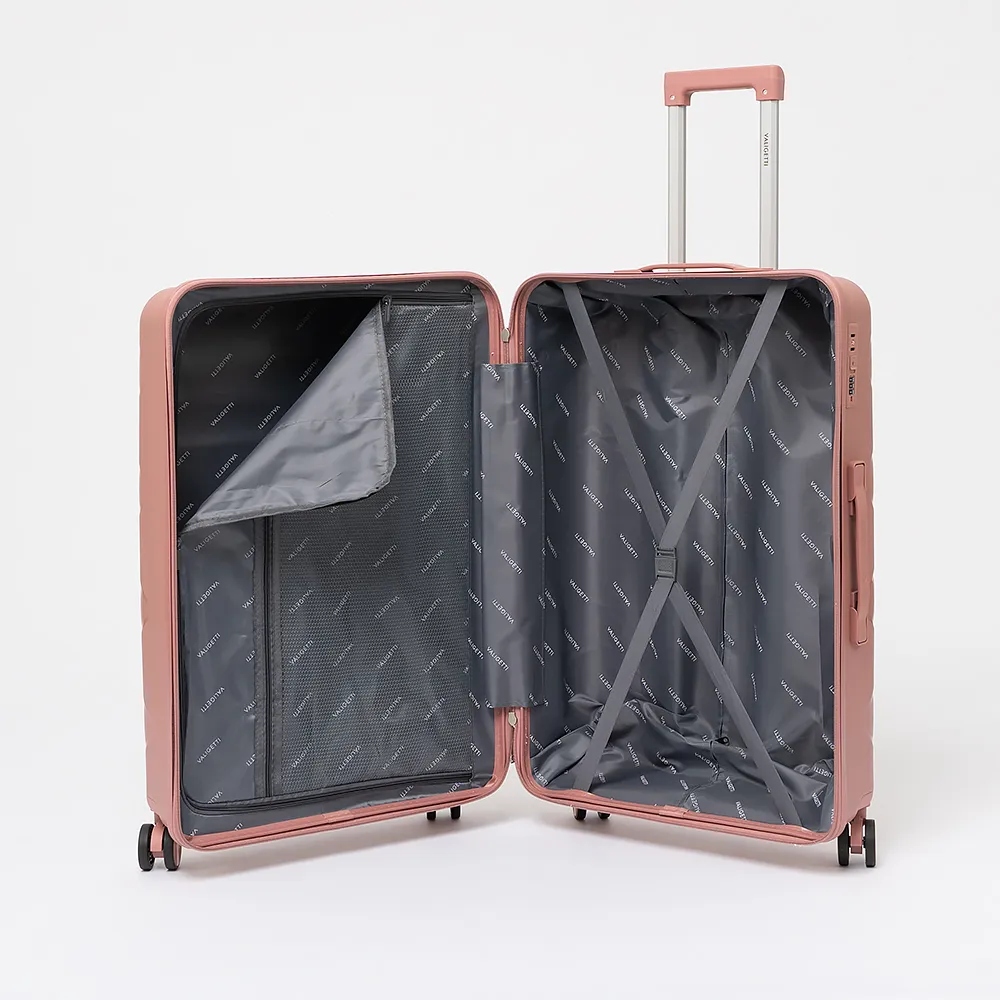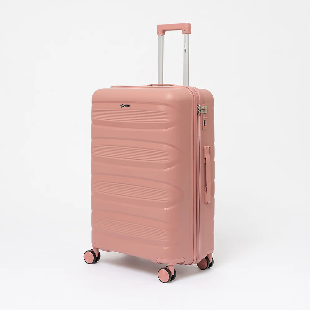 Чемодан-спиннер от торговой марки Valigetti из ударопрочного термостойкого полипропилена с рельефной антивандальной поверхностью бежевого цвета с коричневыми элементами. Модель на четырех сдвоенных колесах, с выдвижной ручкой, ручками-переносками сверху и сбоку, пластиковыми ножками сбоку для защиты от износа. Закрывается молнией №8 антивор, имеется кодовый замок, утопленный в корпус. Внутри: фирменная подкладка, в одной части - клапан-разделитель на молнии, карман-сетка на молнии, в другой части - перекрестные ремни для фиксации багажа. На верхних боковых ножках предусмотрены крючки для подвешивания пакетов.