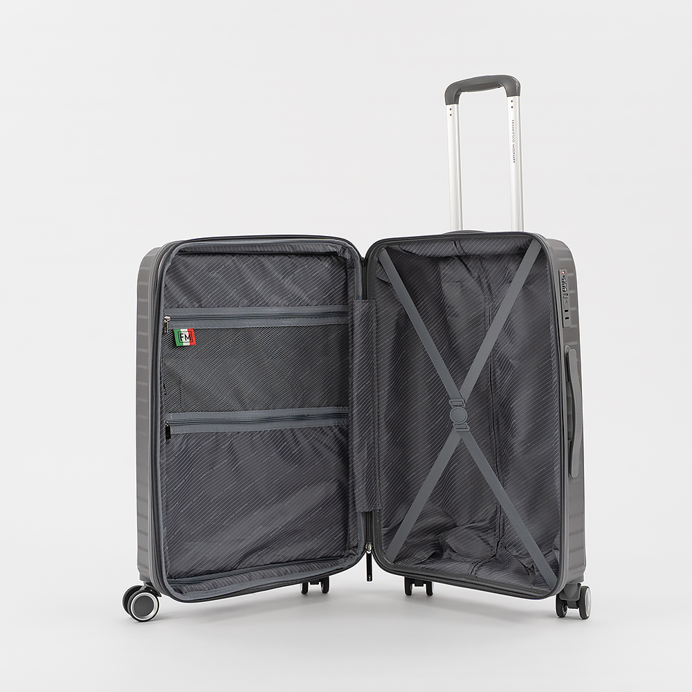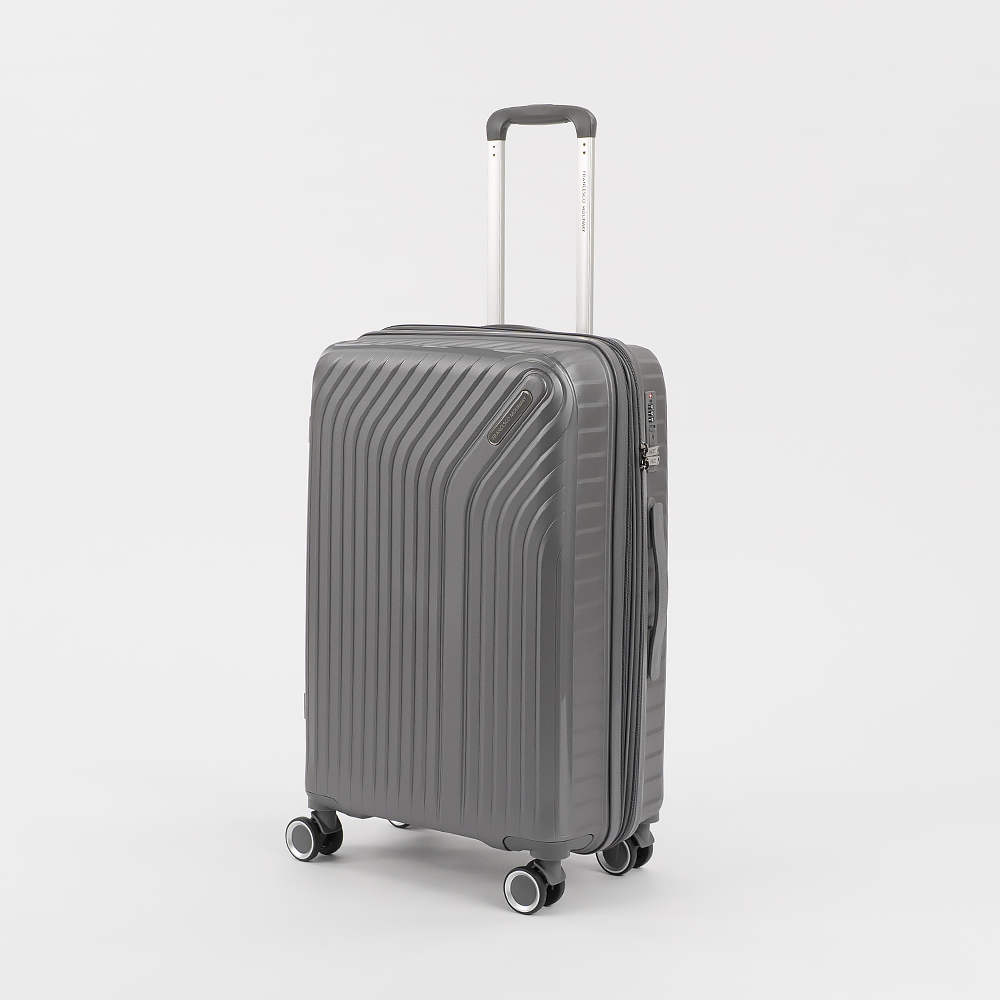 Чемодан-спиннер от торговой марки Francesco Molinary из ударопрочного термостойкого полипропилена с антивандальной рельефной поверхностью в фиолетовом цвете с перламутровым эффектом. Модель на четырех сдвоенных пластиковых колесах, с выдвижной ручкой, ручкой-переноской сверху и сбоку. Закрывается двойной антивандальной молнией, установлен кодовый замок TSA, встроенный в корпус. Внутри: фирменная подкладка, в одной части - перекрестные ремни для фиксации багажа, в другой - клапан-разделитель на молнии, два кармана на молнии. Cбоку имеются крючки для подвешивания сумки или пакета. Оснащен молнией для увеличения объема.