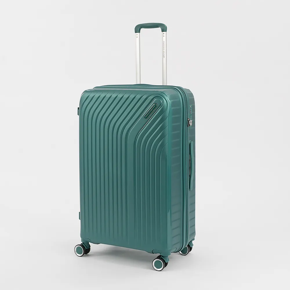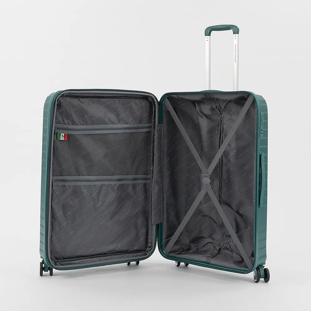 Чемодан-спиннер от торговой марки Francesco Molinary из ударопрочного термостойкого полипропилена с антивандальной рельефной поверхностью в фиолетовом цвете с перламутровым эффектом. Модель на четырех сдвоенных пластиковых колесах, с выдвижной ручкой, ручкой-переноской сверху и сбоку. Закрывается двойной антивандальной молнией, установлен кодовый замок TSA, встроенный в корпус. Внутри: фирменная подкладка, в одной части - перекрестные ремни для фиксации багажа, в другой - клапан-разделитель на молнии, два кармана на молнии. Cбоку имеются крючки для подвешивания сумки или пакета. Оснащен молнией для увеличения объема.