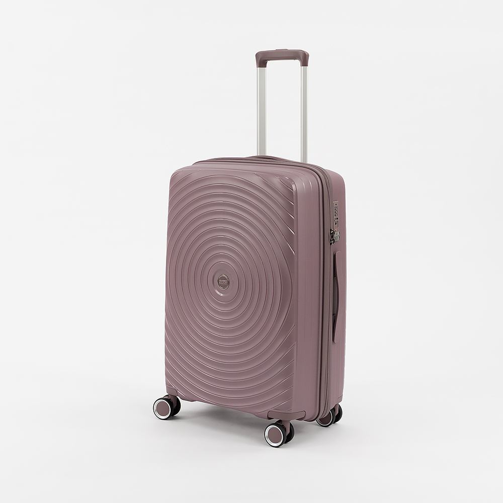 Чемодан-спиннер от торговой марки Francesco Molinary из ударопрочного термостойкого полипропилена с антивандальной узорной поверхностью розового цвета. Модель на четырех сдвоенных пластиковых колесах, с выдвижной ручкой, ручкой-переноской сверху и сбоку. Закрывается антивандальной молнией, установлен кодовый замок TSA, встроенный в корпус. Внутри: фирменная подкладка, в одной части - перекрестные ремни для фиксации багажа, в другой - клапан-разделитель на молнии, карман-сетка на молнии и два кармана без застежки. В средней части имеется дополнительный карман на молнии.