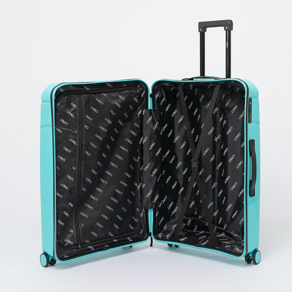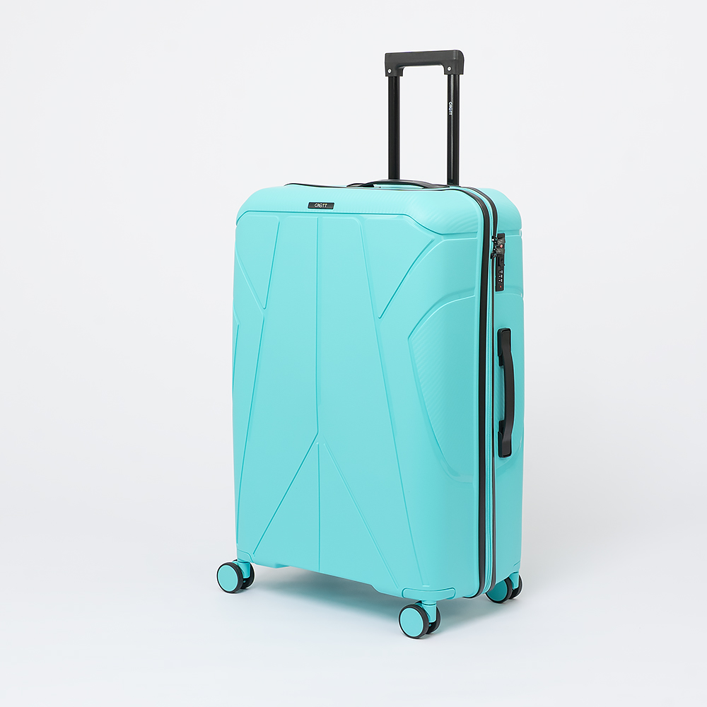 Чемодан-спиннер от торговой марки Grott из ударопрочного термостойкого полипропилена бирюзового цвета с оригинальной рельефной поверхностью. Модель на четырех сдвоенных пластиковых колесах, с выдвижной ручкой, ручками-переносками сверху и сбоку, пластиковыми ножками-опорами сбоку. Закрывается молнией, имеется кодовый замок, утопленный в корпус. Внутри: фирменная подкладка, в одной части - клапан-разделитель на молнии, карман-сетка на молнии, в другой - перекрестные ремни для фиксации багажа. На боковых ножках предусмотрены крючки для подвешивания пакетов.