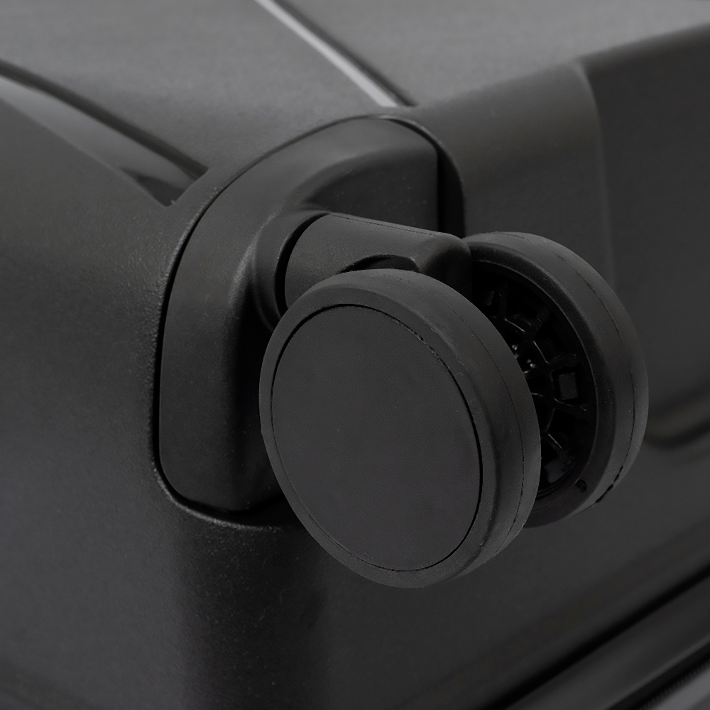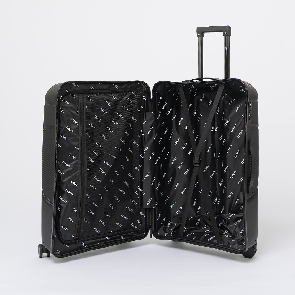 Чемодан-спиннер от торговой марки Grott из ударопрочного термостойкого полипропилена бирюзового цвета с оригинальной рельефной поверхностью. Модель на четырех сдвоенных пластиковых колесах, с выдвижной ручкой, ручками-переносками сверху и сбоку, пластиковыми ножками-опорами сбоку. Закрывается молнией, имеется кодовый замок, утопленный в корпус. Внутри: фирменная подкладка, в одной части - клапан-разделитель на молнии, карман-сетка на молнии, в другой - перекрестные ремни для фиксации багажа. На боковых ножках предусмотрены крючки для подвешивания пакетов.