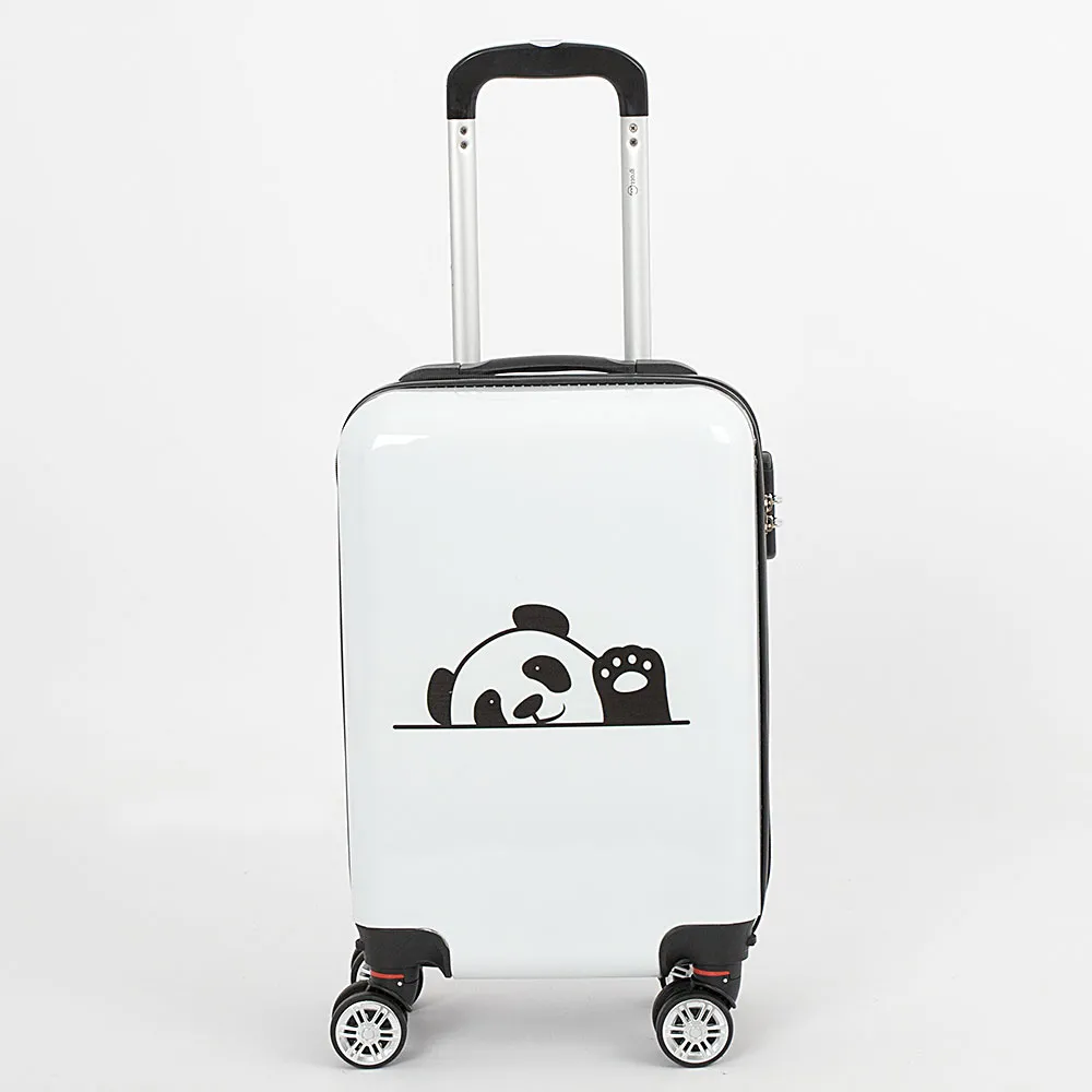 Детский чемодан-спиннер от торговой марки Grott из прочного ABS-пластика и поликарбоната белого цвета. Декорирован оригинальным рисунком с изображением панды. Модель на четырех сдвоенных съемных пластиковых колесах, с выдвижной металлической ручкой с кнопкой, ручкой сверху. Закрывается молнией 8 размера; имеется кодовый замок. Внутри: уплотненная текстильная подкладка; в одной части – перекрестные ремни для фиксации багажа на застежке фастекс, в другой части – разделитель-сетка на молнии. Чемодан подойдет в качестве ручной клади.