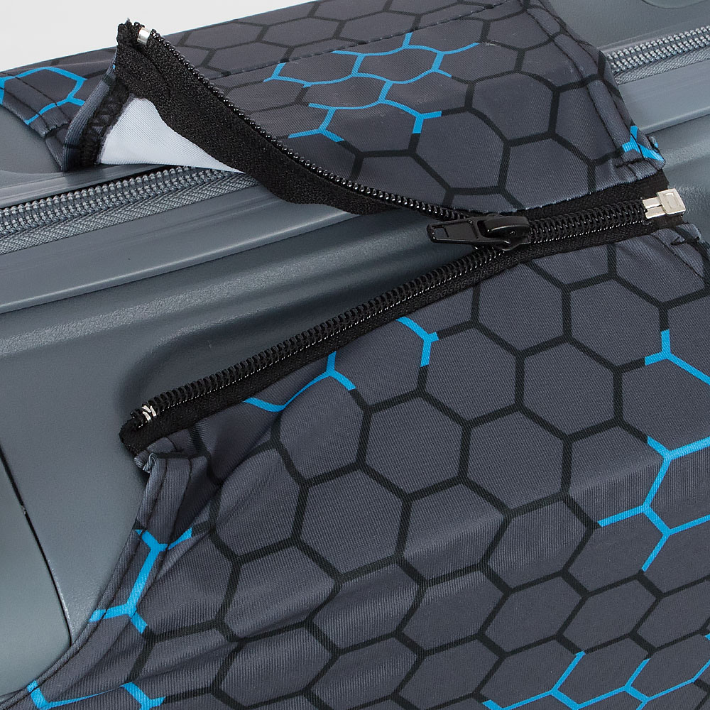 Чехол для чемодана от торговой марки Grott выполнен из прочного эластичного материала. Модель размером M подходит для чемоданов с диагональю от 22 до 26 дюймов. Застегивается снизу на молнию, имеет отверстия для переносных ручек и выдвижной ручки чемодана. Дорожный аксессуар защитит багаж от загрязнений и повреждений, а оригинальный принт с сотами поможет опознать чемодан на багажной ленте.