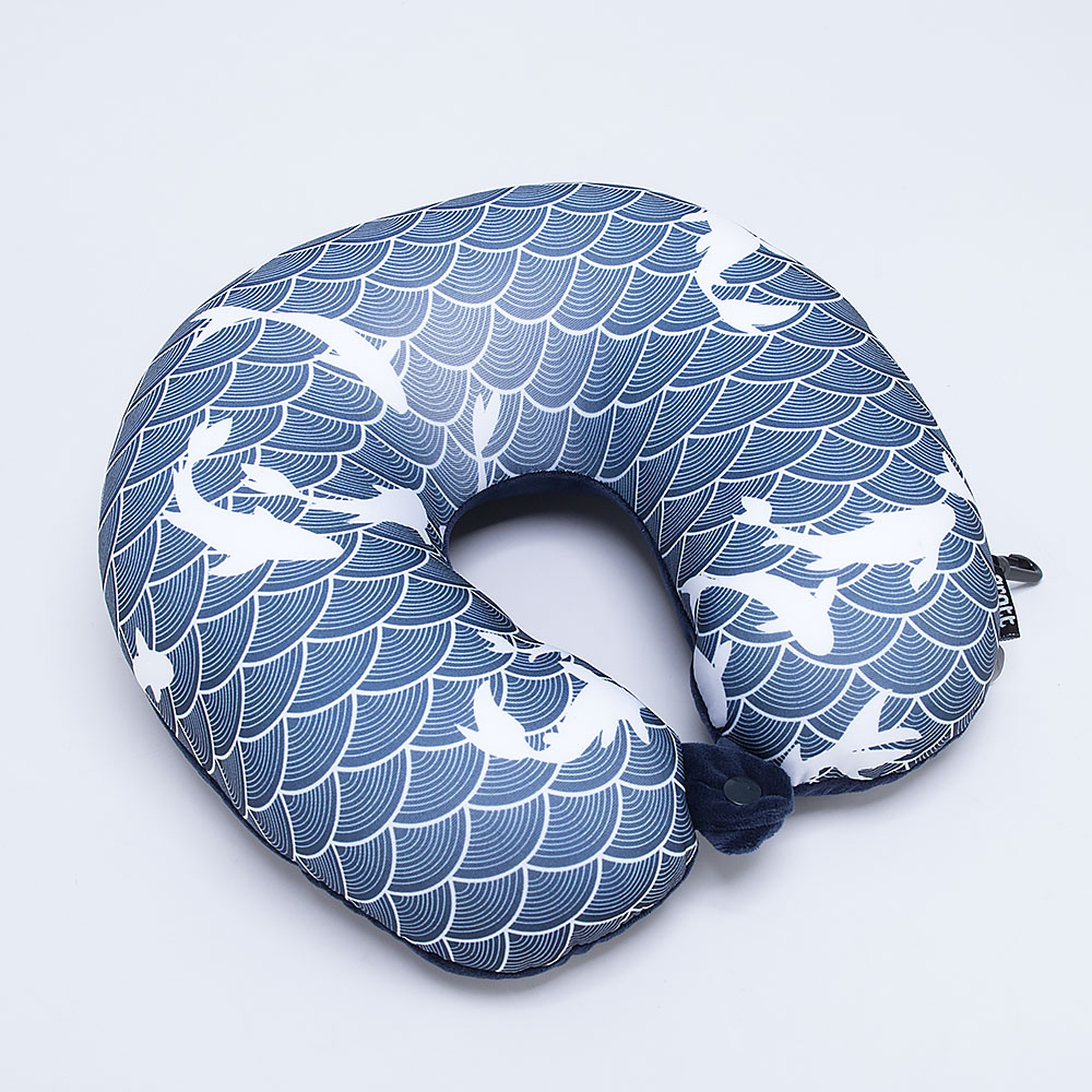 Подушка для путешествий от торговой марки Grott выполнена в сочетании двух материалов - лавсан и флис с принтом в полоску. Подушка наполнена пористыми гранулами, которые обеспечивают надежную поддержку и снимают напряжение в шейном и плечевом отделе позвоночника. В нижней части имеется кнопка для фиксации подушки. Сверху - петля, а сбоку - пластиковый карабин для крепления.