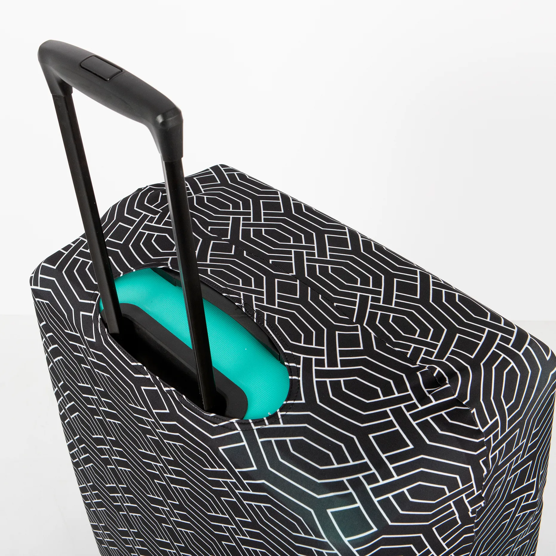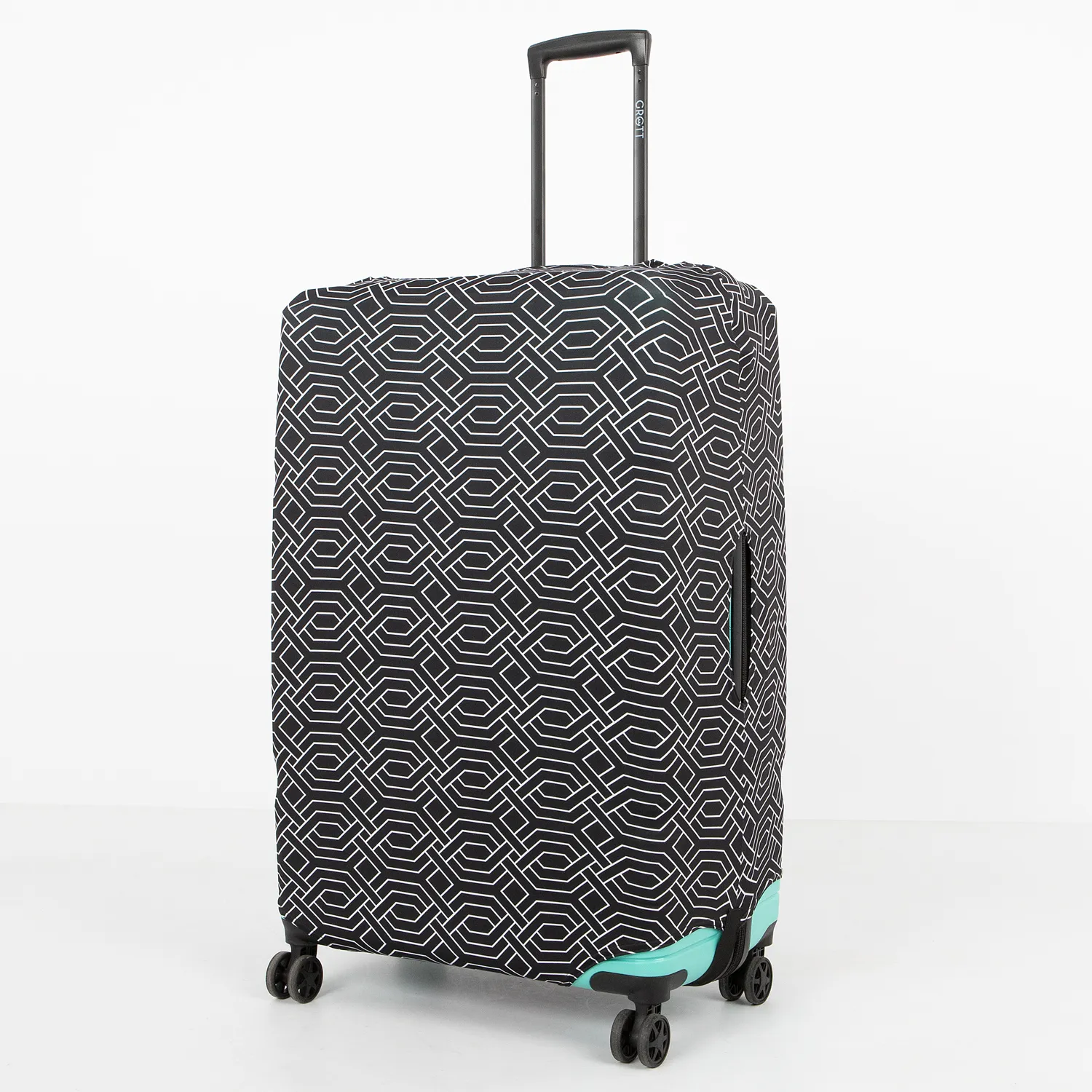 Практичный чехол для чемодана от торговой марки Grott выполнен из прочного текстиля. Дорожный аксессуар поможет предохранить багаж от загрязнений, вскрытий и мелких повреждений. Чехол эластичный, подходит для чемоданов с диагональю от 26 до 28 дюймов. Застегивается снизу на липучку и дополнен эластичным ремешком с фастексом, имеет отверстия слева и справа для переносных ручек и сверху для выдвижной ручки чемодана. Оригинальный геометрический принт поможет опознать свой чемодан на багажной ленте в аэропорту.