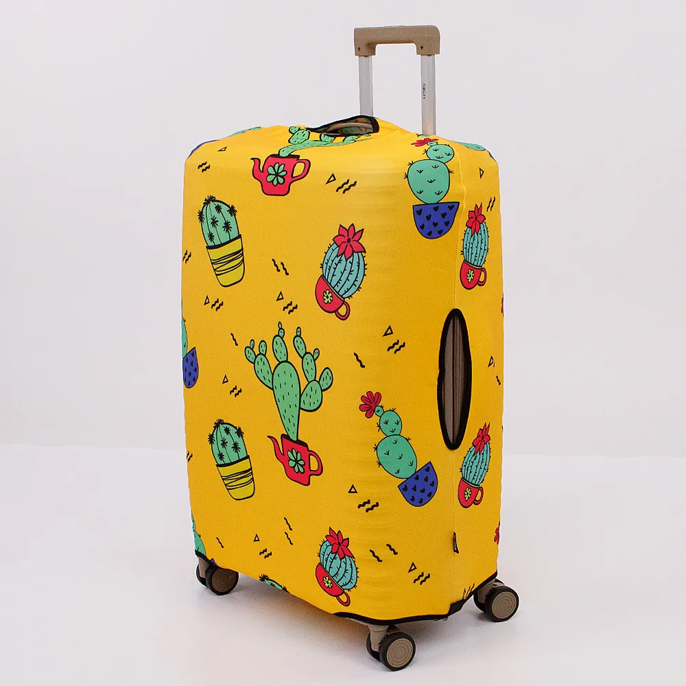 Чехол для чемодана от торговой марки Grott выполнен из прочного эластичного материала. Модель размером L подходит для чемоданов с диагональю от 26 до 28 дюймов. Застегивается снизу на молнию, фиксируется ремешком с застежкой фастекс; имеет отверстия для переносных ручек и выдвижной ручки чемодана. Дорожный аксессуар защитит багаж от загрязнений и повреждений, а оригинальный яркий принт с кактусами поможет опознать чемодан на багажной ленте.