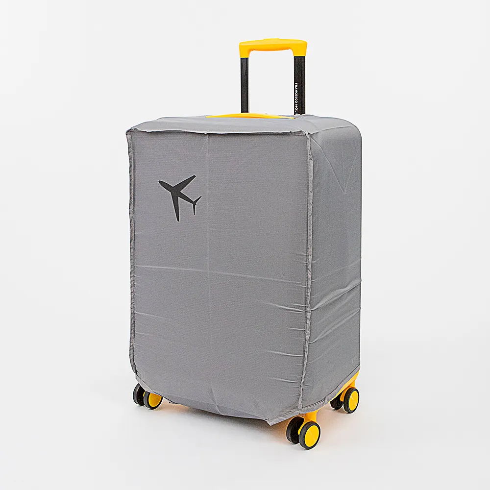 Чехол для чемодана от торговой марки Grott из текстильного материала. Декорирован принтом с изображением самолета. Модель для чемоданов с диагональю от 22 до 26 дюймов; снизу застегивается на липучку, имеет прорези для ручек багажа по бокам и сверху. Дорожный аксессуар поможет предохранить багаж от загрязнений, вскрытий и мелких повреждений. Размер: M.