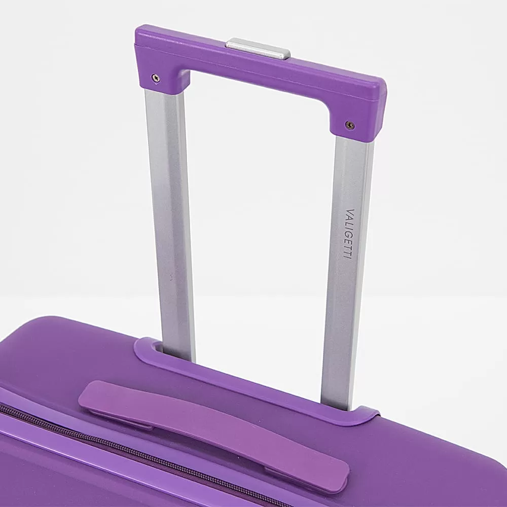 Чемодан Valigetti — это прочная модель, изготовленная из ударопрочного и термостойкого пластика. У чемодана рельефное антивандальное покрытие фиолетового цвета. Чемодан оснащён четырьмя сдвоенными пластиковыми колёсами, выдвижной металлической ручкой и ручкой для переноски сверху. Чемодан закрывается на фирменную молнию с двумя встречными бегунками. Также он имеет кодовый замок TSA, встроенный в корпус. Внутри вы обнаружите фирменную подкладку и перекрёстные ремни для фиксации багажа. На одной стороне чемодана есть клапан-разделитель с молнией, а на другой — карман-сетка с молнией. Размеры чемодана: длина — 35 см, ширина — 20 см, высота — 48 см (с учётом колёс — 54 см).