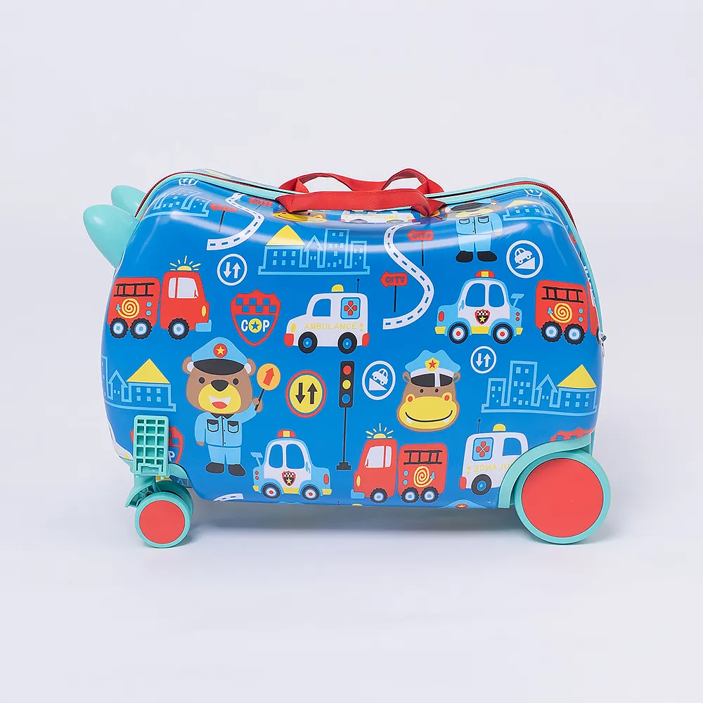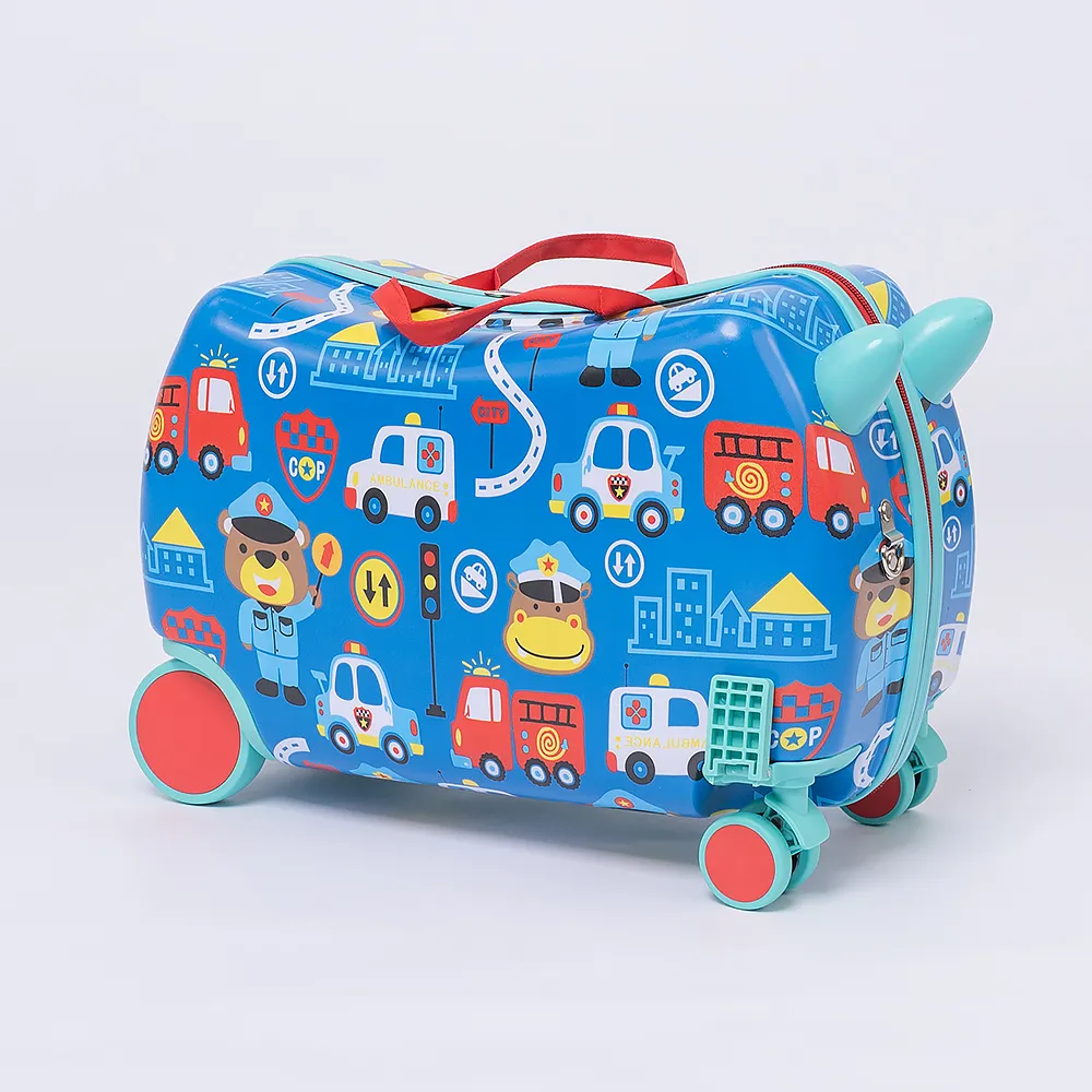 Чемодан-каталка из ударопрочного ABS пластика и поликарбоната в синем цвете с элементами красного цвета с изображением машинок и мишек. Модель на четырех колесах, два из которых поворотные, два - нет. С двумя ручками переносками и съемным регулируемым плечевым ремнем. Закрывается молнией. Внутри: фирменная подкладка, в одной из частей - клапан-разделитель на молнии, в другой - перекрестные ремни для фиксации багажа. Имеется дополнительный кармашек на молнии.