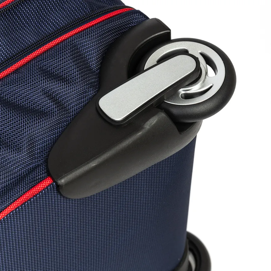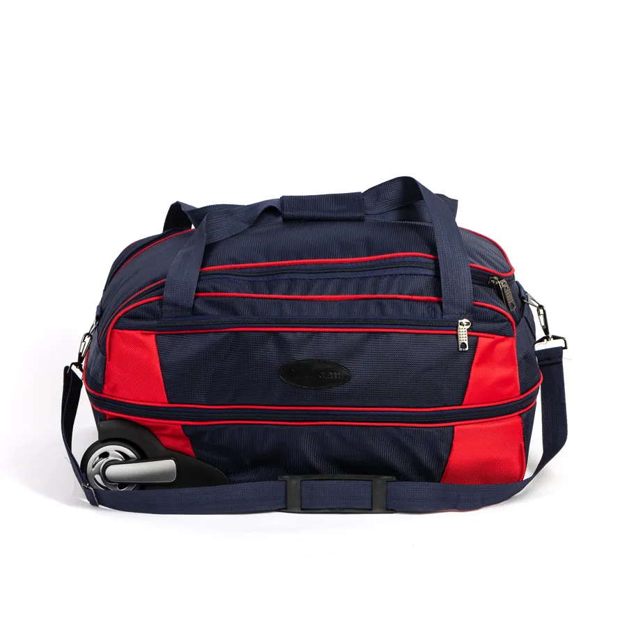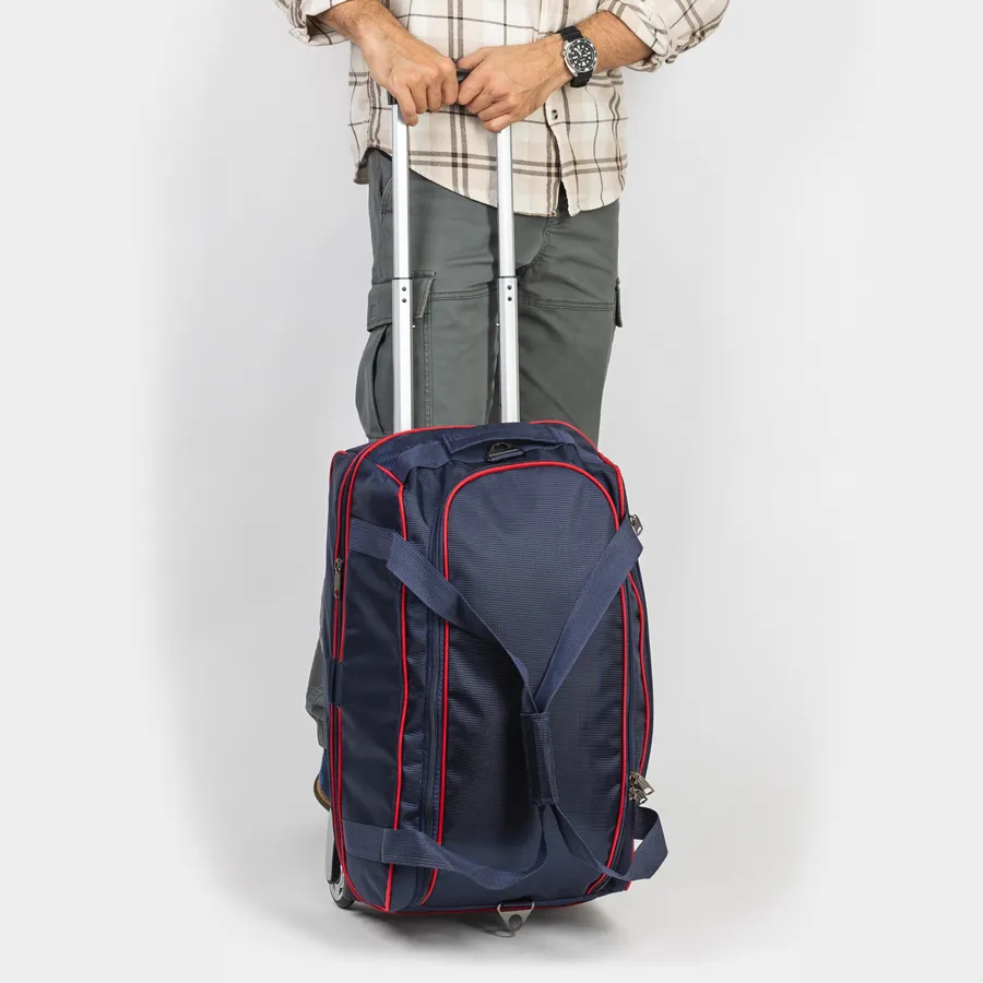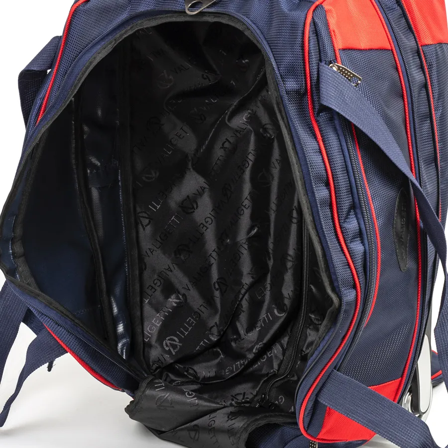 Большая дорожная сумка-тележка от бренда Valigetti выполнена из плотного полиэстера в синем цвете с красными вставками. Модель с одним вместительным отделением на молнии, снабжена двумя колёсами, которые для надёжности утоплены в корпус, выдвигающейся ручкой для перевозки и текстильными ручками с фиксирующим ремешком на липучке. Снаружи дополнительный прорезной карман на молнии и специальная молния по периметру для увеличения объёма.