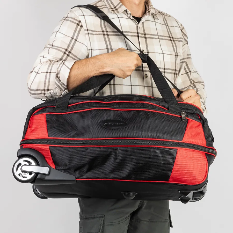 Большая дорожная сумка-тележка от бренда Valigetti выполнена из плотного полиэстера в черном цвете с красными вставками. Модель с одним вместительным отделением на молнии, снабжена двумя колёсами, которые для надёжности утоплены в корпус, выдвигающейся ручкой для перевозки и текстильными ручками с фиксирующим ремешком на липучке. Снаружи дополнительный прорезной карман на молнии и специальная молния по периметру для увеличения объёма.