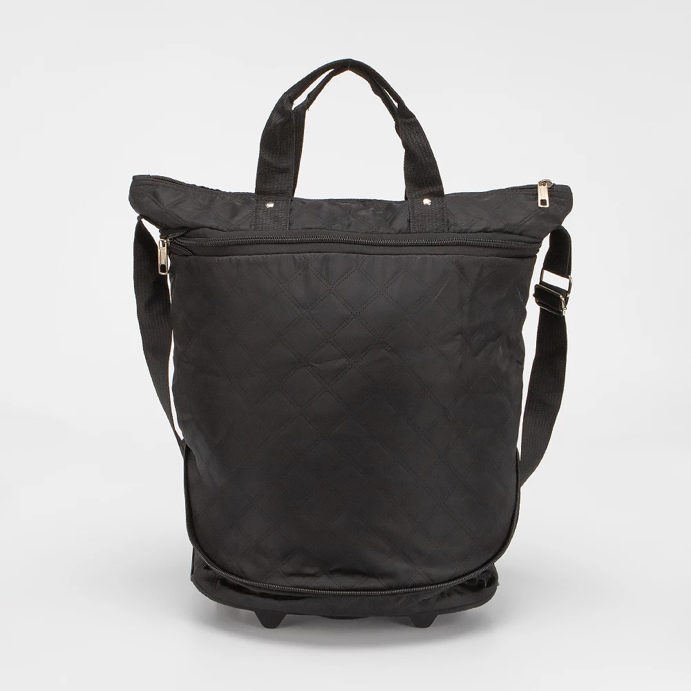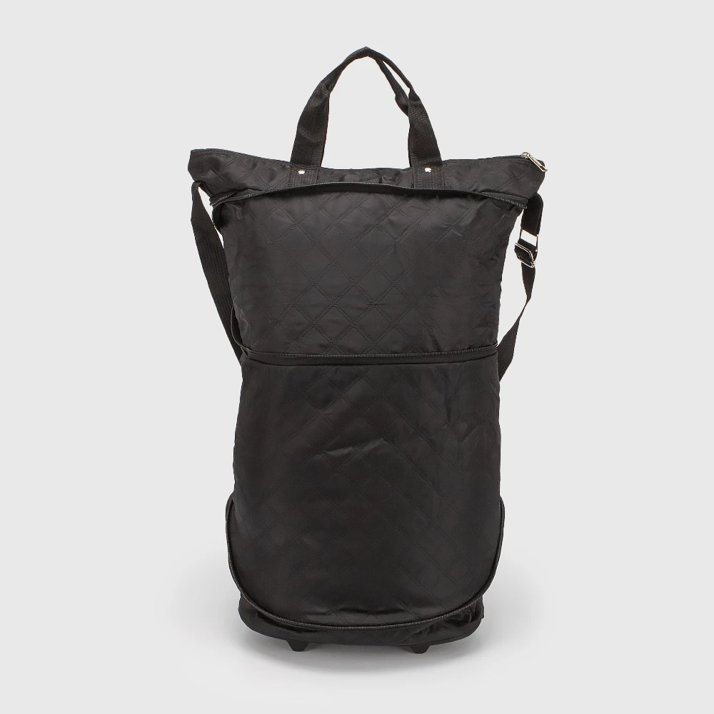 Практичная хозяйственная сумка от бренда Valigetti выполнена из плотной текстильной ткани черного цвета. Модель-трансформер с двумя колесами, утопленными в корпус. В сложенном виде компактна и имеет ручку-переноску и карман на молнии. В разложенном виде возможно два варианта сложения благодаря раздвижке на молнии. Сумка с двумя ручками, несъемным регулируемым плечевым ремнем. Глубокое отделение на молнии. На задней стороне — карман на молнии. На дне имеются ножки-держатели.