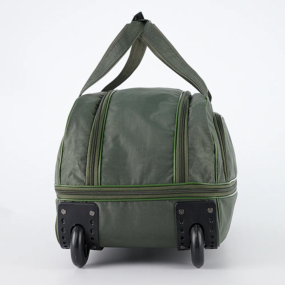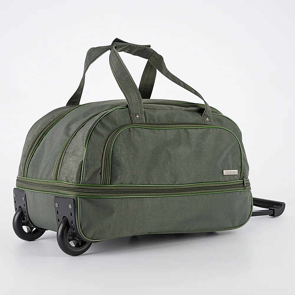 Дорожно-спортивная сумка на колёсах от торговой марки Mr.Bag выполнена из текстильной ткани жатка цвета хаки. Модель с двумя колесами, для надежности утопленными в корпус, с выдвижной ручкой, двумя удлиненными ручками с фиксатором, ручкой с прорезиненной накладкой сбоку. Закрывается клапаном на молнии. На лицевой стороне – карман на молнии. Имеется раздвижка на молнии для увеличения объема. Сбоку и на дне – круглая пластиковая ножка для устойчивости и защиты от износа.