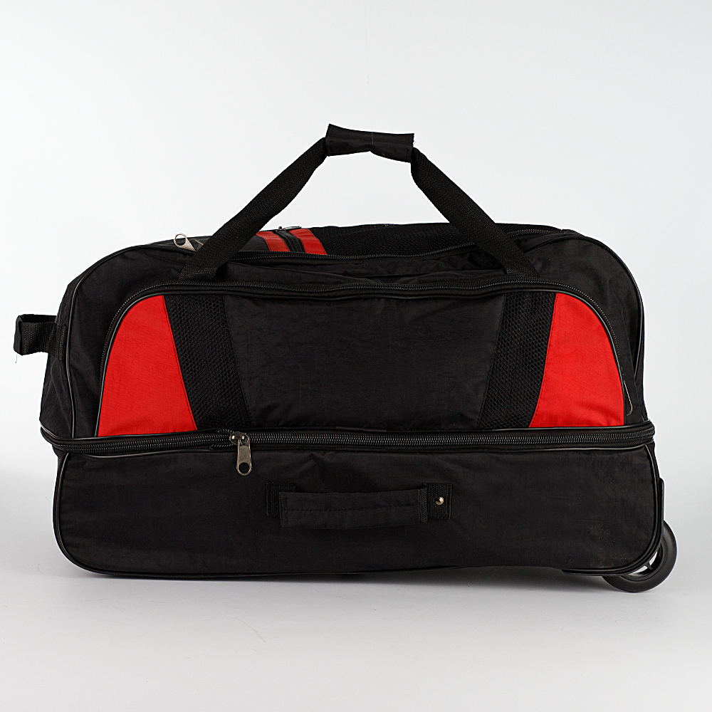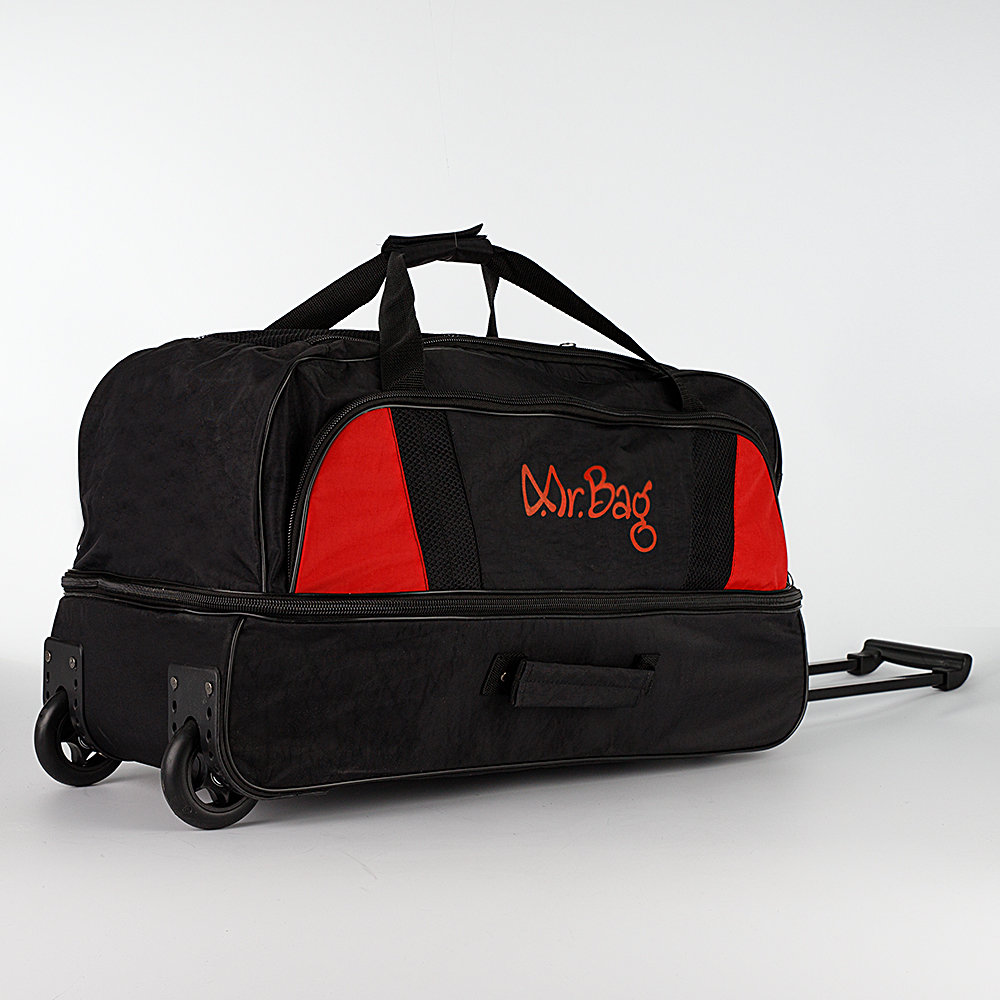 Дорожная сумка на колёсах от торговой марки Mr.Bag выполнена из практичного текстильного материала серого цвета с мягкой ромбовидной стежкой. Модель на двух колесах, для надежности утопленных в корпус, с выдвижной ручкой, двумя удлиненными ручками с фиксатором на липучке, двумя ручками по бокам и ручкой сверху. Закрывается клапаном на круговой молнии. Отделение без подкладки. На лицевой стороне – накладной карман на молнии, на задней – карман на молнии. Имеется раздвижка на молнии для увеличения объема. Дно сумки оснащено большой круглой пластиковой ножкой. Сумка весом 2,4 кг рассчитана на объем до 106,5 литров.