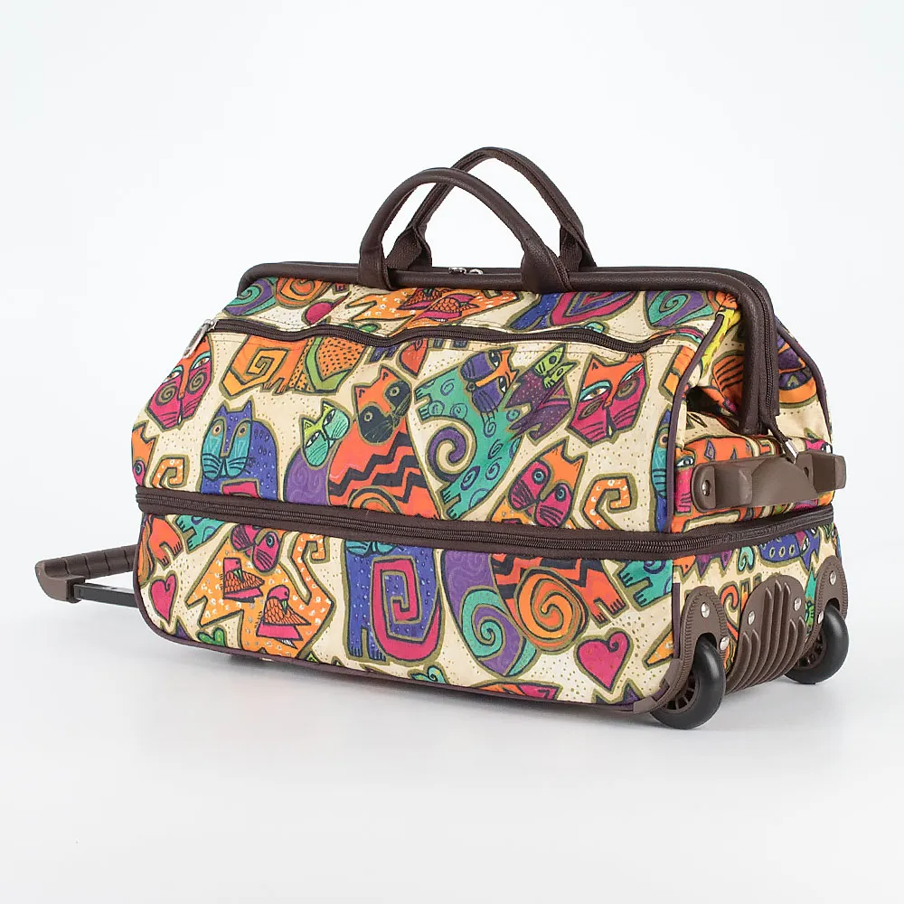 Большая дорожная сумка-саквояж на колёсах от торговой марки TSV выполнена из практичного полиэстера. Модель яркой расцветки с оригинальным изображением котов; на двух колёсах, утопленных в корпус. Имеется выдвижная ручка, две плотные ручки, ножки с держателем, круглая пластиковая ножка на дне. Отделение на рамочном замке, на молнии. Внутри: текстильная подкладка, карман на молнии. На задней стороне – карман на молнии. Объем сумки увеличивается с помощью раздвижки на молнии.