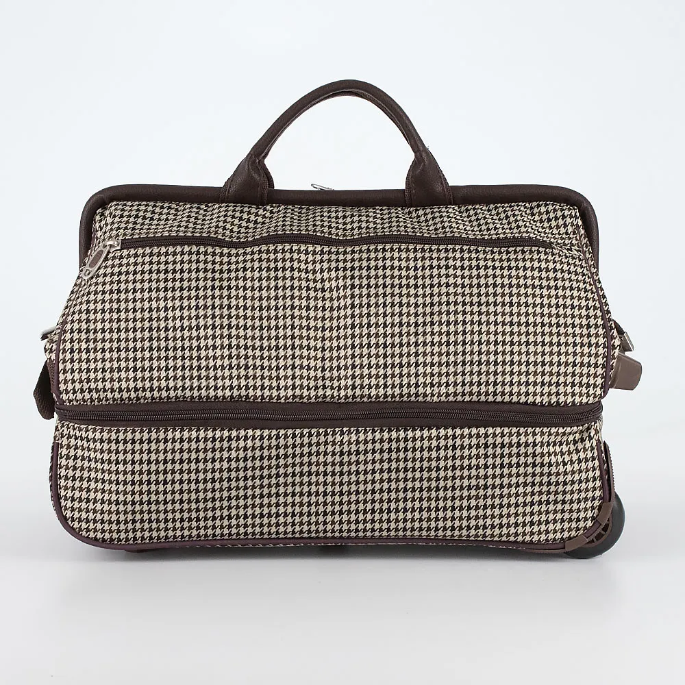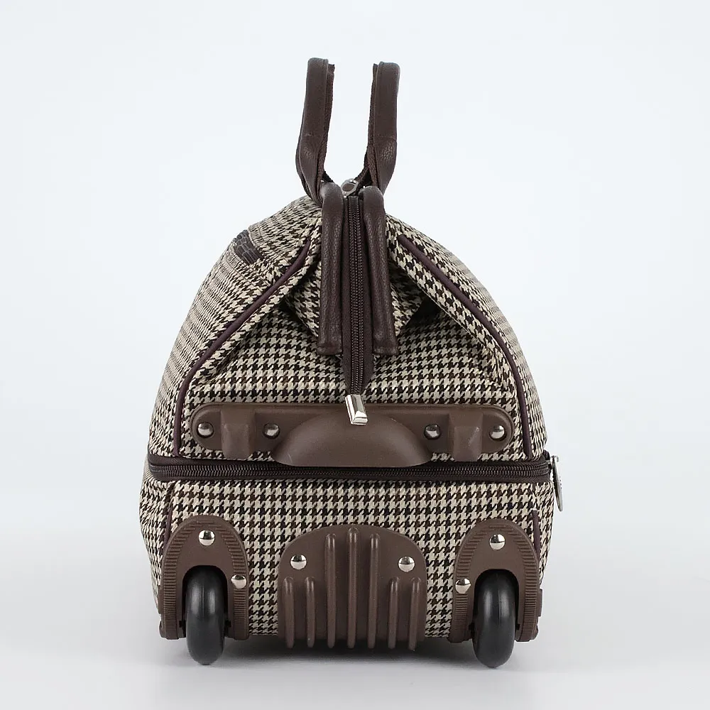 Дорожная сумка-саквояж от торговой марки TSV из плотного материала и искусственной кожи в сочетании бежевого и коричневого цвета с принтом «гусиная лапка». Вместительная модель на двух колесах с выдвижной ручкой, ручкой-переноской, с двумя плотными ручками, пластиковой ножкой на дне, ножками-опорами и держателем в нижней части. Отделение на молнии с рамочным открытием. Внутри: карман. На лицевой стороне – карман на молнии. Имеется раздвижка на молнии для увеличения объема. Вес сумки 2,02 кг.