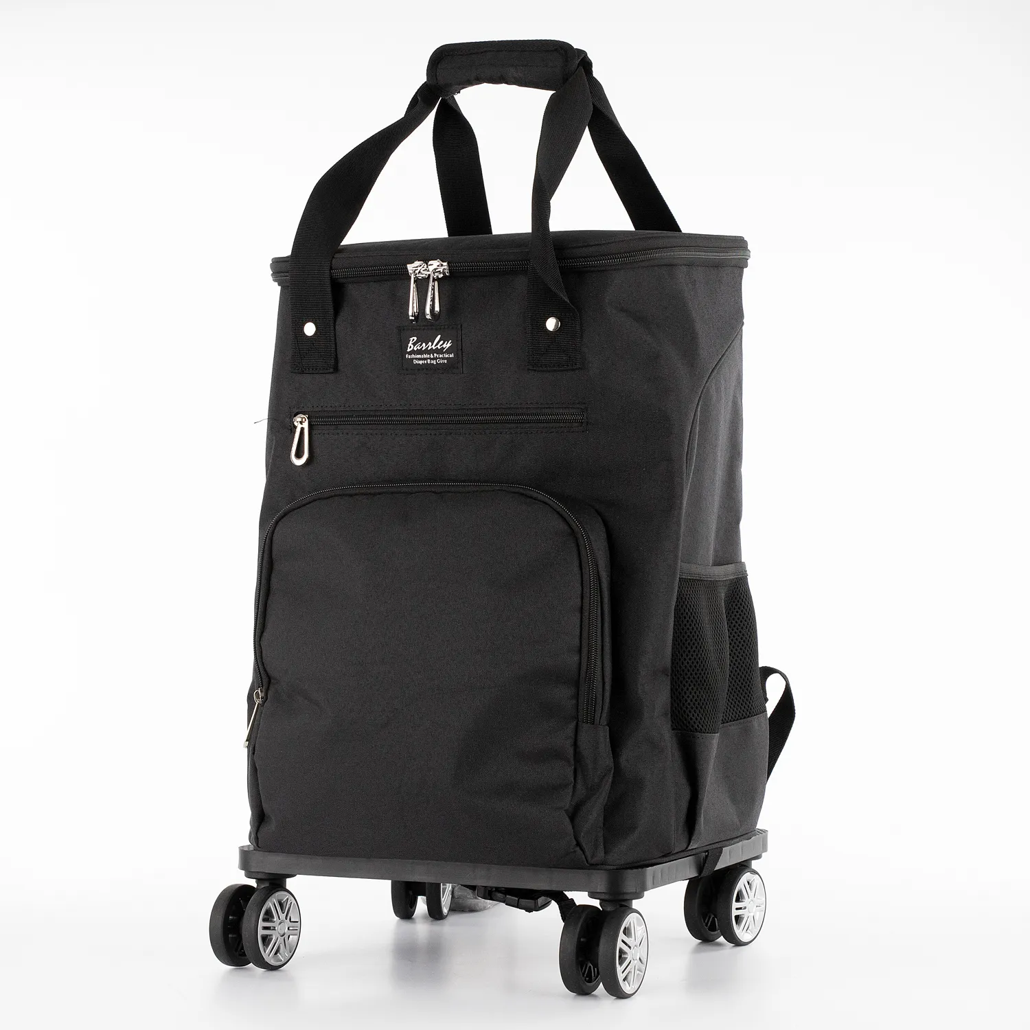 Сумка-рюкзак на тележке от торговой марки Barrley Prince. Сумка-рюкзак с двумя ручками с фиксатором на липучке, выдвижной ручкой и регулируемыми плечевыми лямками. Глубокое термо-отделение закрывается клапаном на молнию с двумя встречными бегунками с отверстиями для навесного замка, не входящего в комплект. Внутри: съемная термоизоляционная подкладка для продолжительного сохранения первоначальной температуры содержимого вне зависимости окружающей среды. На лицевой стороне – карман на молнии. По бокам – карман-сетка. На спинке – накладная лямка для крепления на тележку. Модель крепится к подставке на четырех сдвоенных колесах; для удобного компактного хранения выдвижная ручка складывается на подставку. Сумка-рюкзак на тележке – незаменимый помощник во время отдыха на пляже, дачных поездок, путешествий, на пикниках, рыбалке. Также это отличный вариант использования сумки в качестве резервной камеры для хранения продуктов в периоды временного отсутствия электроэнергии. Для получения максимально продолжительного эффекта, сумку следует загружать менее, чем на 65% от общего объема внутреннего контейнера.