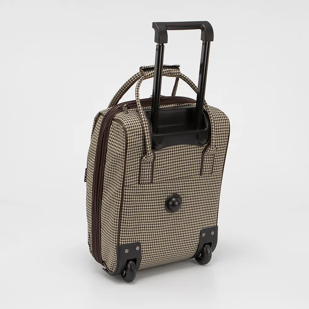 Сумка-тележка от торговой марки Mr.Bag из практичного текстильного материала коричневого цвета с принтом гусиная лапка. Модель на двух колесах, утопленных в корпус, с выдвижной ручкой, двумя ручками с фиксатором на липучке, пластиковыми ножками и держателем на дне. Отделение на молнии широко раскрывается на 180 градусов. Внутри: текстильная подкладка, перекрестные ремни для фиксации багажа в обеих частях. Имеется раздвижка для увеличения объема. На лицевой стороне - карман на молнии.