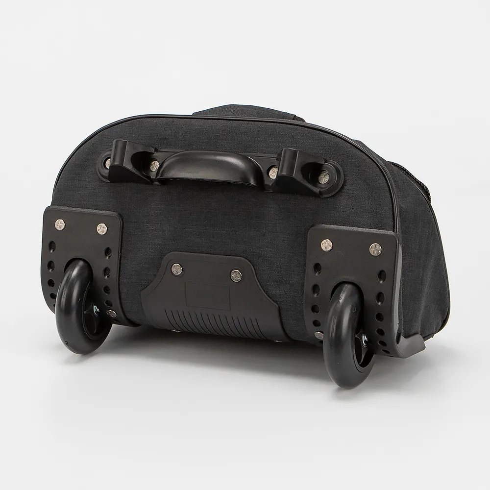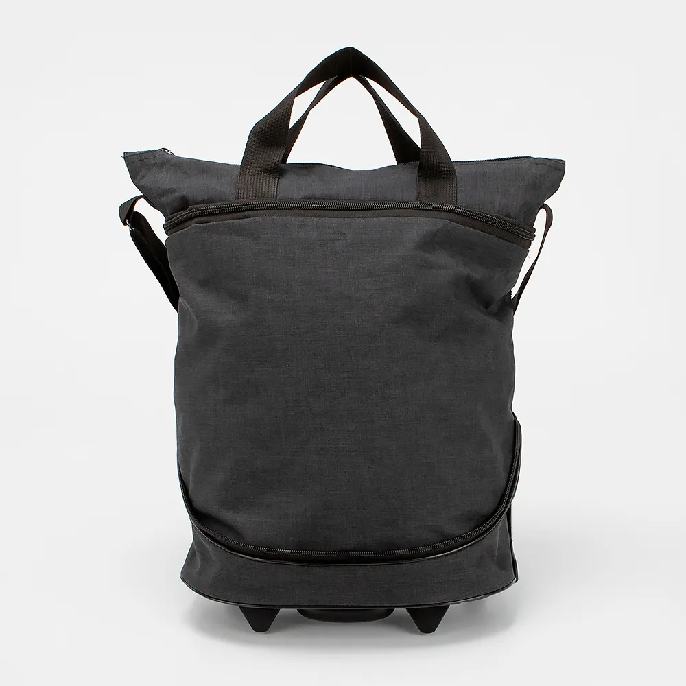Складная сумка от торговой марки Mr.Bag из практичного текстильного материала черного цвета. Модель на двух колесах, для надежности утопленных в корпус, две ножки-опоры и пластиковый держатель для удобства переноски и подъема; в сложенном виде имеет ручку-переноску и карман на молнии на задней стороне. В разложенном виде имеет две ручки и несъёмный регулируемый плечевой ремень. Отделение на молнии. Внутри: без подкладки.
