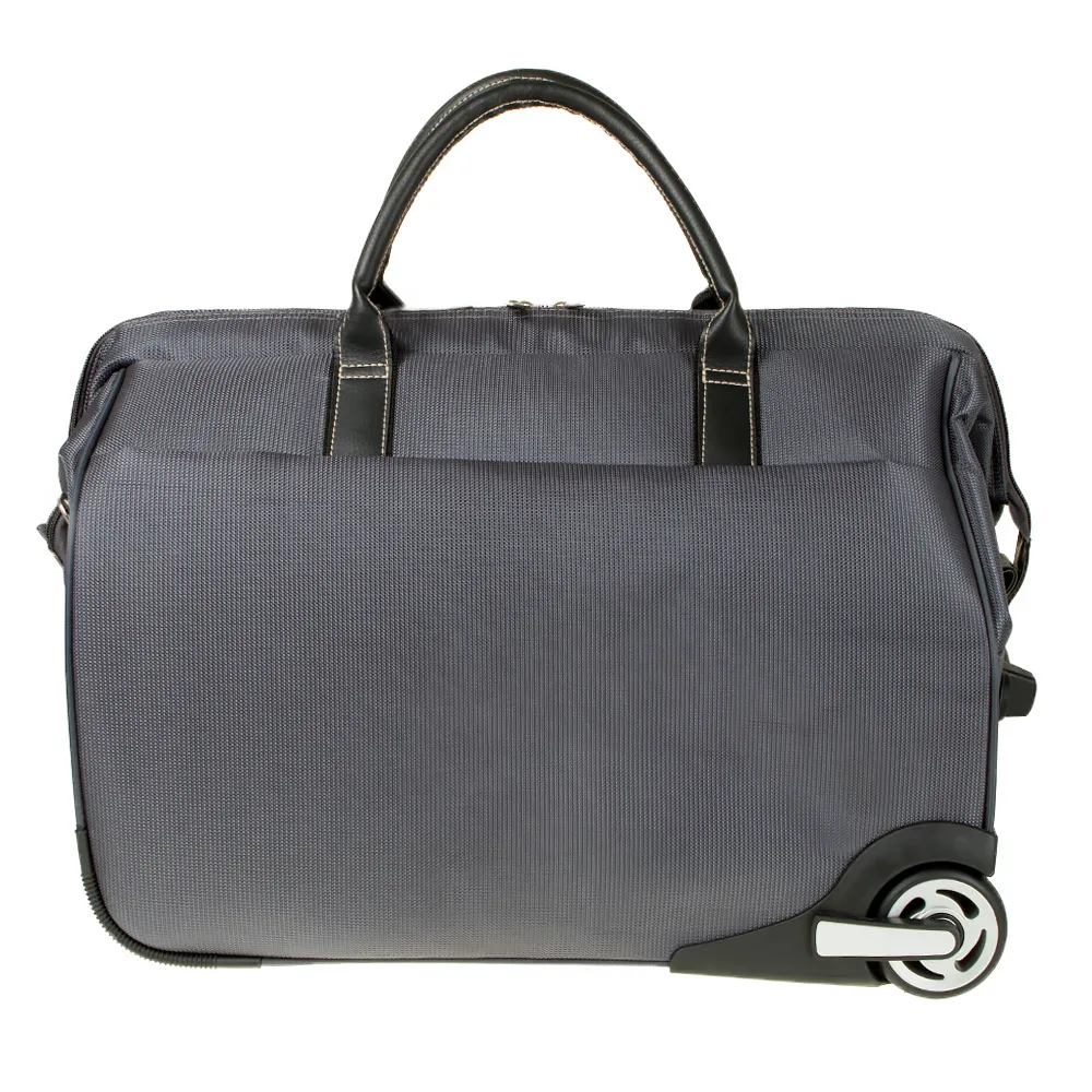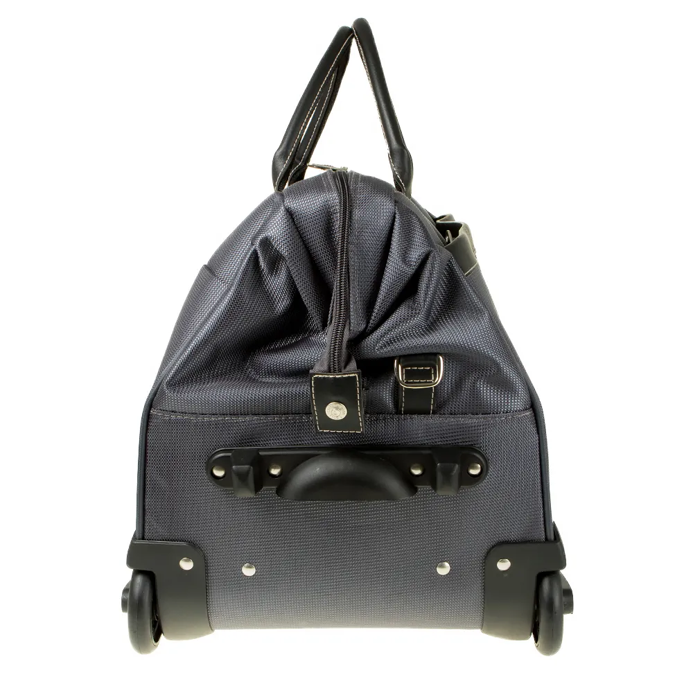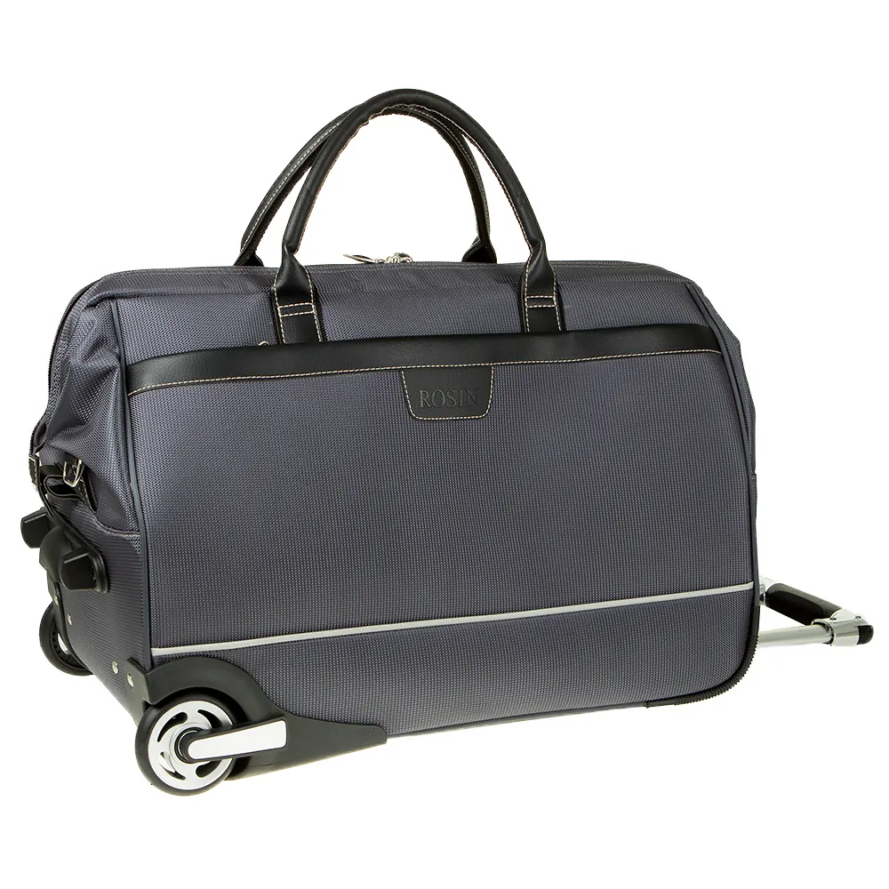 Дорожная сумка-саквояж на колесах от бренда Росин выполнена из практичного полиэстера и искусственной кожи чёрного цвета. Модель с рамочной конструкцией; на двух колесах, утопленных в корпус, с двумя плотными ручками, выдвижной ручкой, съемным плечевым ремнем, пластиковыми ножками, ножкой-держателем. Отделение на молнии, с текстильной подкладкой и карманом на молнии. На лицевой стороне – карман на молнии.