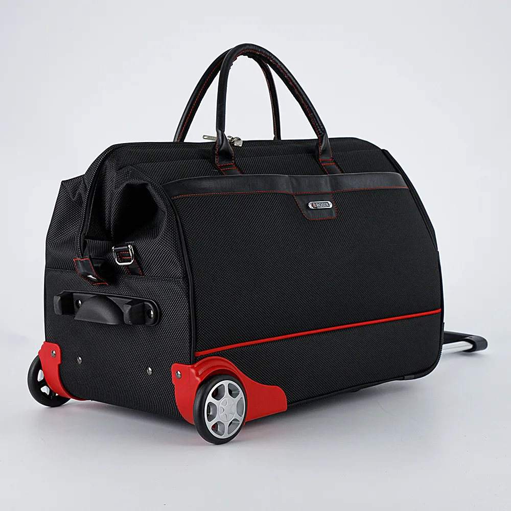 Дорожная сумка-саквояж на колесах от бренда Росин выполнена из практичного полиэстера и искусственной кожи чёрного цвета. Модель с рамочной конструкцией; на двух колесах, утопленных в корпус, с двумя плотными ручками, выдвижной ручкой, съемным плечевым ремнем, пластиковыми ножками, ножкой-держателем. Отделение на молнии, с текстильной подкладкой и карманом на молнии. На лицевой стороне – карман на молнии.