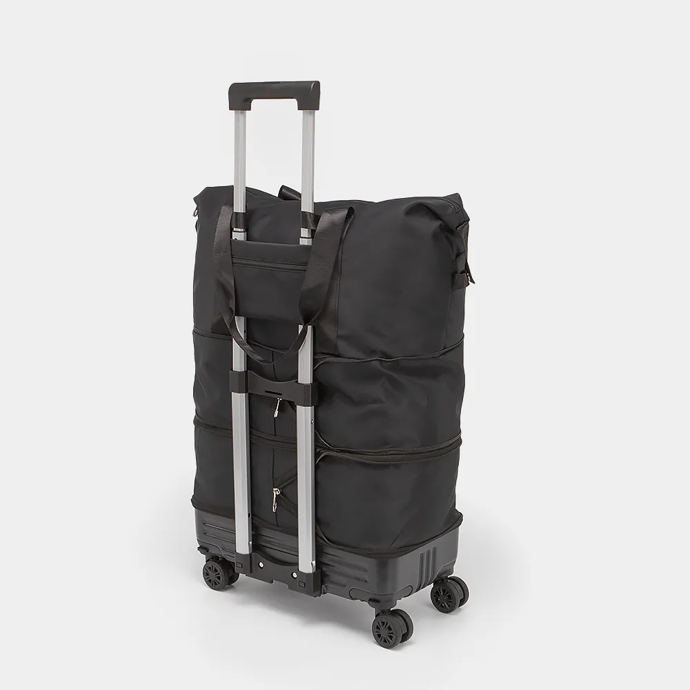 Практичная хозяйственная сумка-тележка от торговой марки Valigetti выполнена из плотной текстильной ткани черного цвета. Модель-трансформер с четырьмя двойными съемными колесами. В сложенном виде компактна и имеет две удлиненные ручки. В разложенном виде возможно два варианта сложения благодаря раздвижке на молнии. Сумка с выдвижной металлической ручкой. Глубокое отделение на молнии. На задней стороне - петля для крепления на выдвижную ручку и карман на молнии.