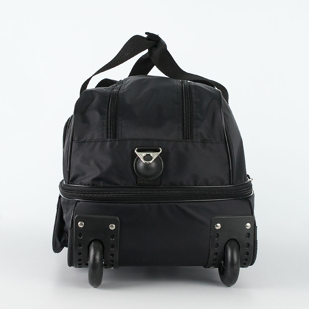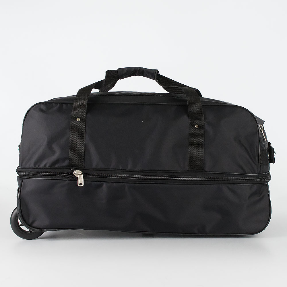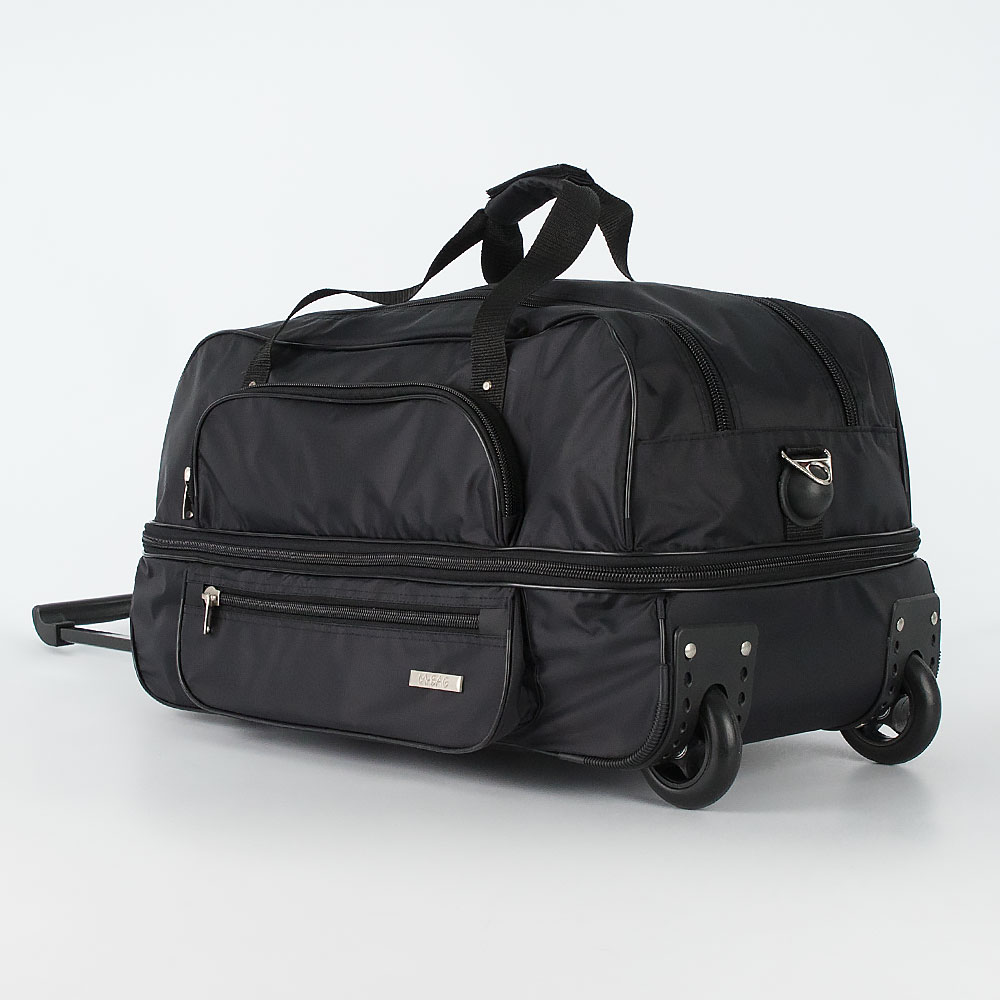 Дорожная сумка на колёсах от торговой марки Mr.Bag выполнена из плотного и практичного текстильного материала синего цвета. Сумка оснащена двумя колёсами, которые для надёжности утоплены в корпус, выдвижной ручкой, двумя ручками с фиксатором на липучке, съемным регулируемым плечевым ремнем, ручкой-переноской, пластиковыми ножками на дне и сбоку. Вместительное отделение закрывается двумя молниями. Внутри: без подкладки. На лицевой стороне – два кармана на молнии. Имеется раздвижка на молнии для увеличения объёма. Сумка весом 990 грамм рассчитана на объем 57,6 литров.