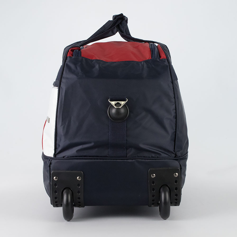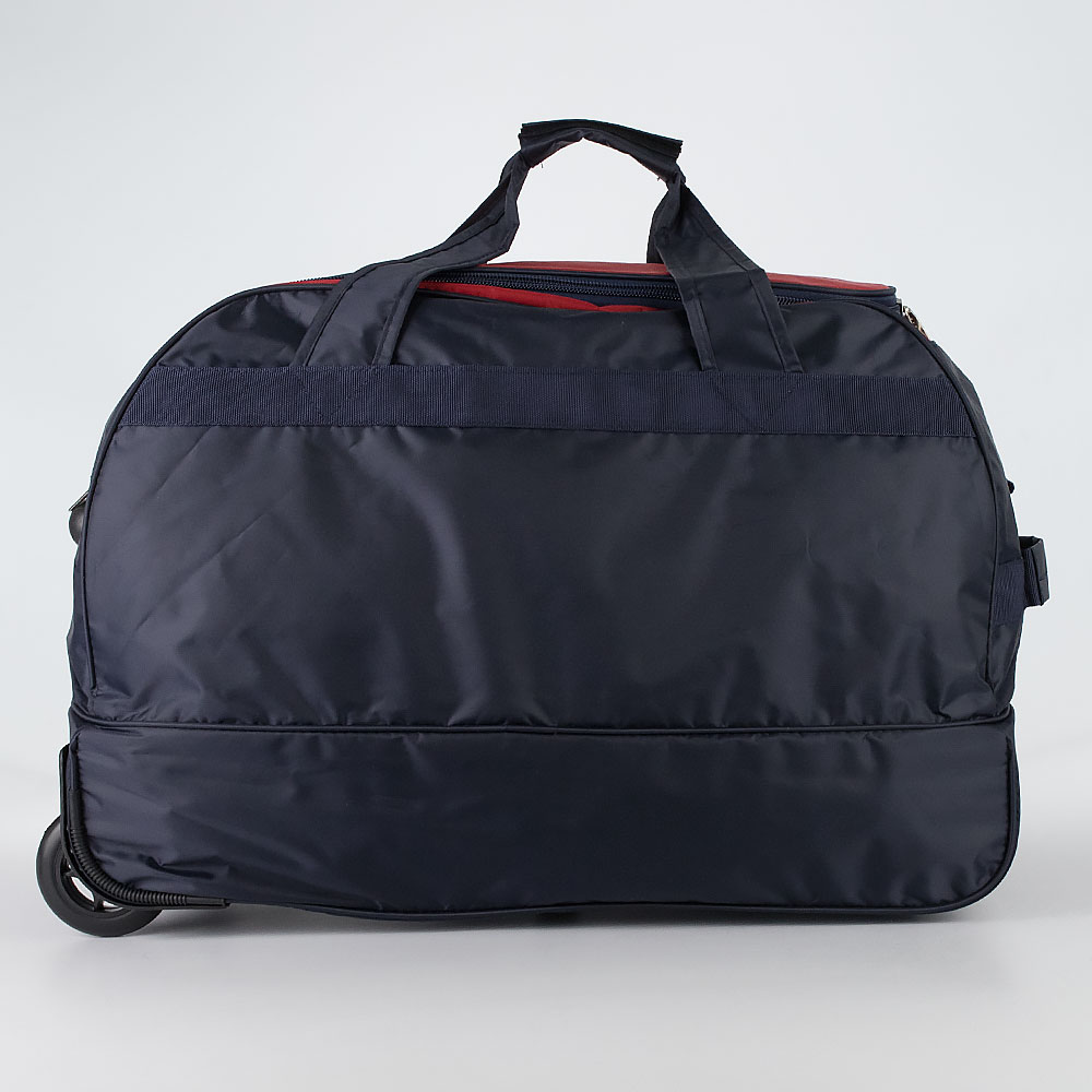 Дорожная сумка на колёсах марки Mr.Bag выполнена в тёмно-синем цвете с красно-белой вставкой из практичного полиэстера, материала устойчивого к загрязнениям. Сумка оснащена двумя колёсами, которые для надёжности утоплены в корпус, выдвижной металлической ручкой и двумя ручками для переноски с фиксатором на липучке. Основное вместительное отделение застёгивается на молнию. В комплекте предусмотрен плечевой ремень.