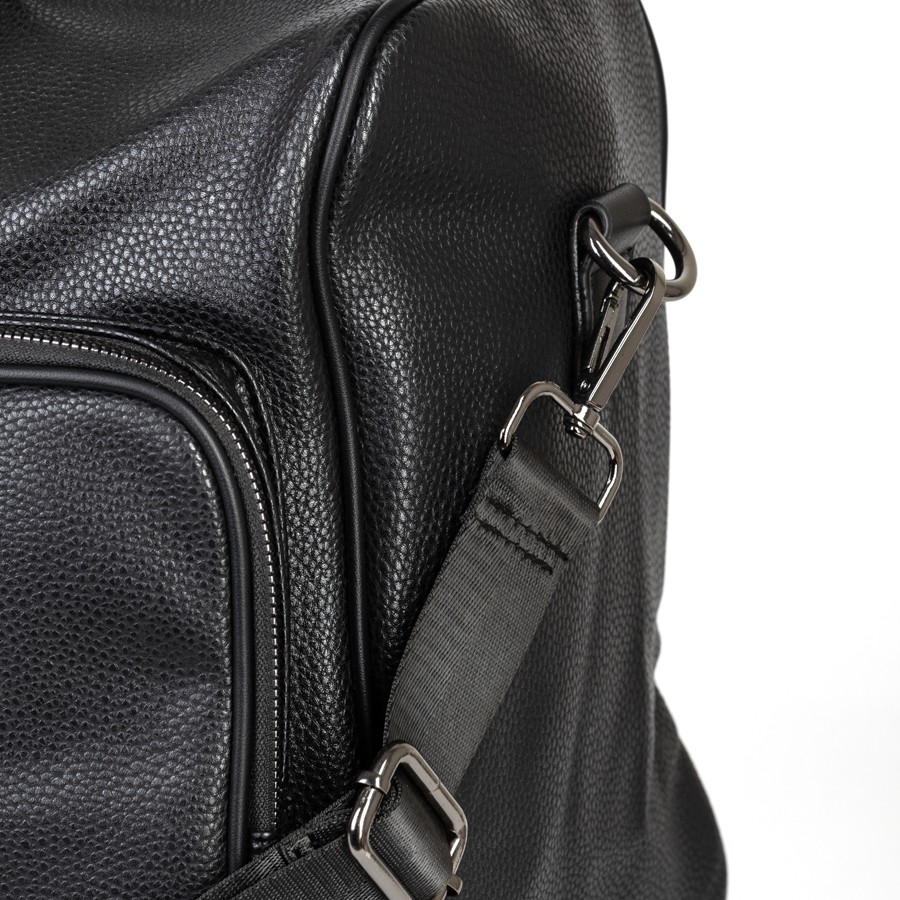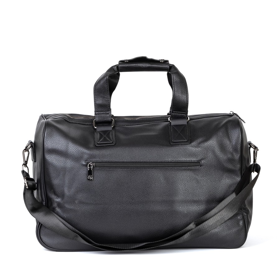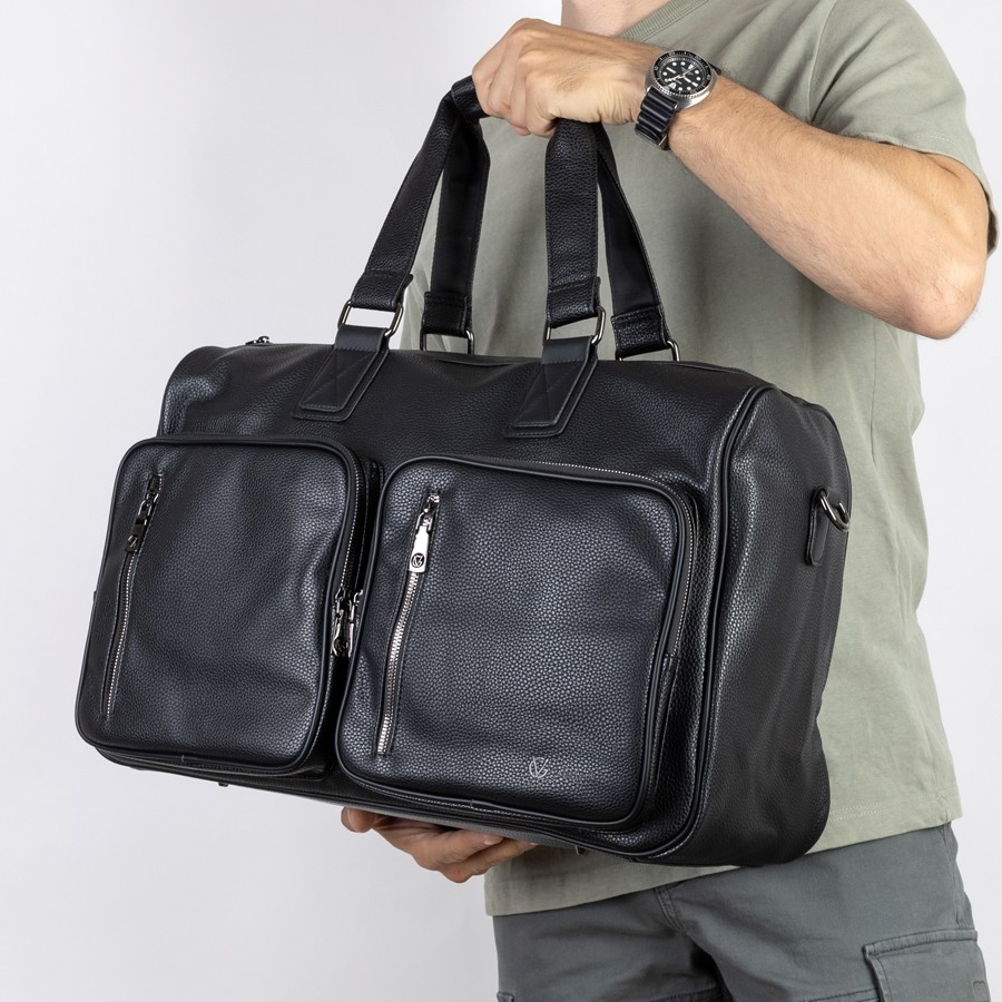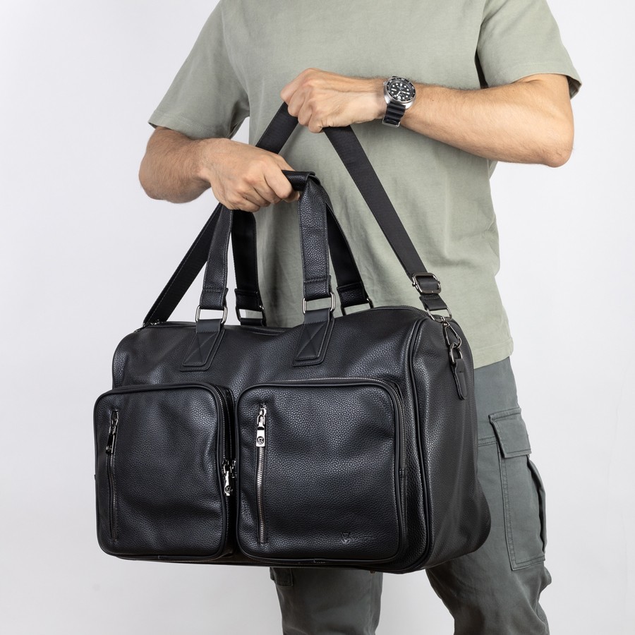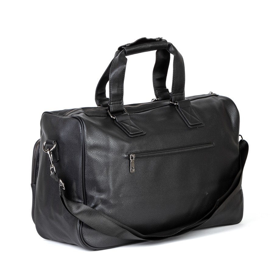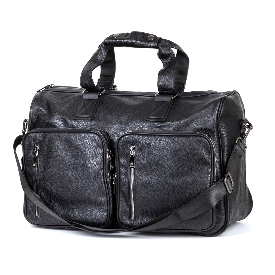 Дорожно-спортивная сумка от торговой марки Valigetti выполнена из искусственной кожи черного цвета. Модель с двумя ручками с фиксатором на кнопках и съемным плечевым ремнем, выполненным из текстильного материала. Отделение на молнии. Внутри: текстильная подкладка, карман на молнии, накладные карманы. На лицевой стороне - четыре кармана на молнии. На задней стороне - карман на молнии.
