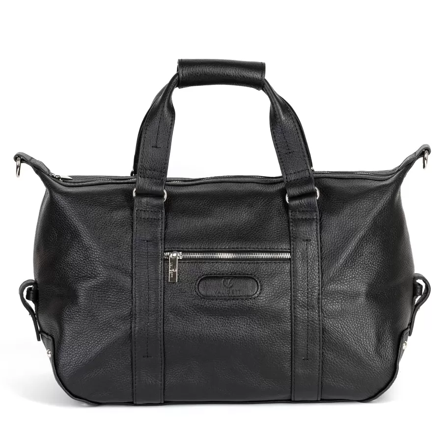 Дорожная сумка Valigetti из натуральной кожи черного цвета с зернистой структурой. Прошита фирменной подкладочной тканью. Имеет кожаные ручки с заклепкой для их соединения. Внутри одно отделение под молнией, карман на молнии и 2 кармашка для мелких вещей. На передней стороне есть карман на молнии. Есть ножки, чтобы ставить сумку на поверхность. В комплект входит съемный плечевой ремень
