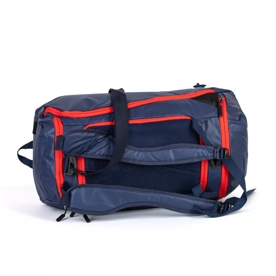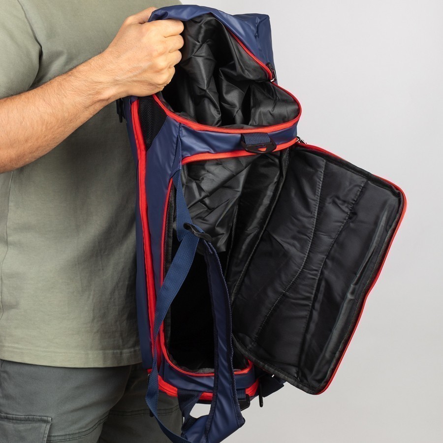 Дорожно-спортивная сумка-рюкзак от торговой марки Valigetti из практичного текстильного материала синего цвета. Модель с двумя ручками, съемным регулируемым плечевым ремнем и плечевыми лямками. Закрывается клапаном на молнии с двумя встречными бегунками. Внутри: карман на молнии.