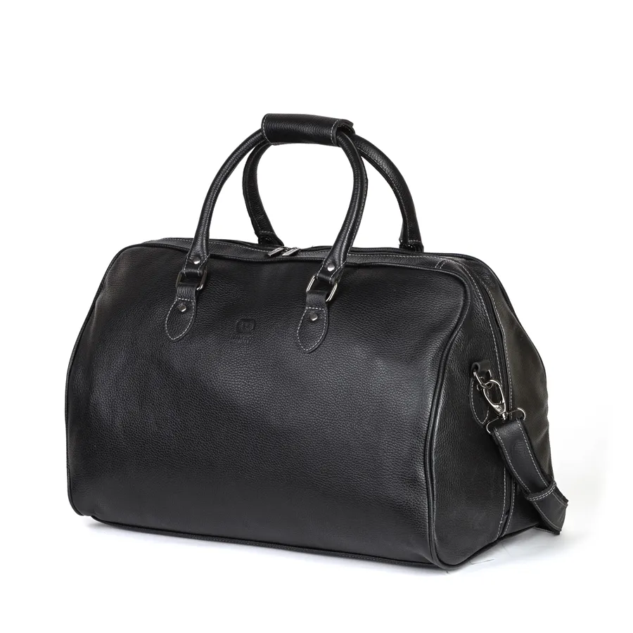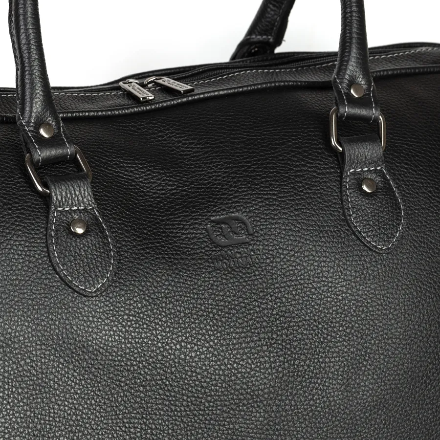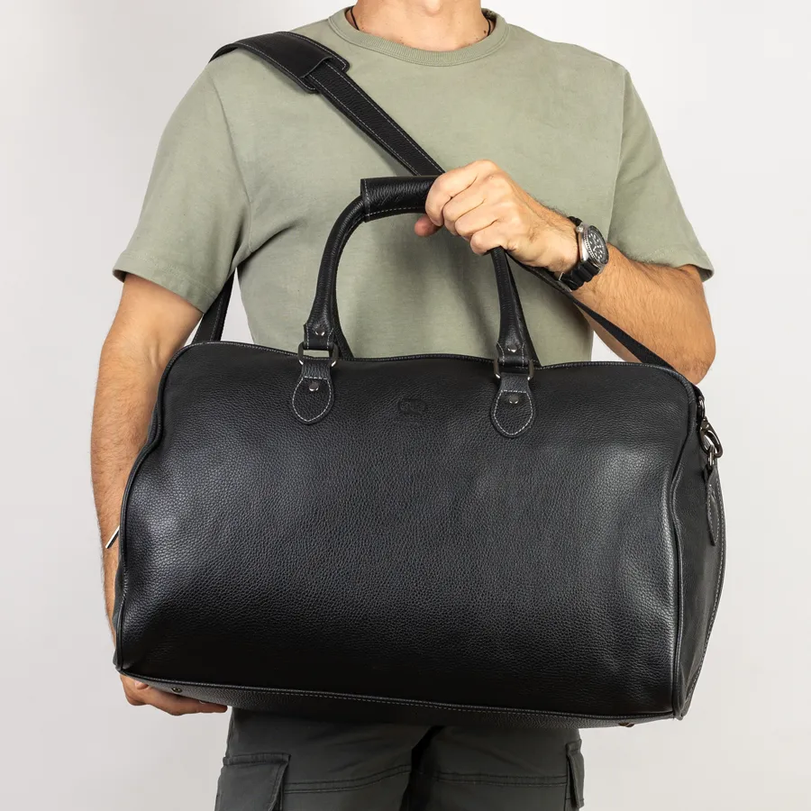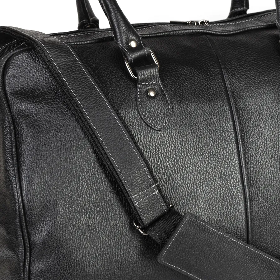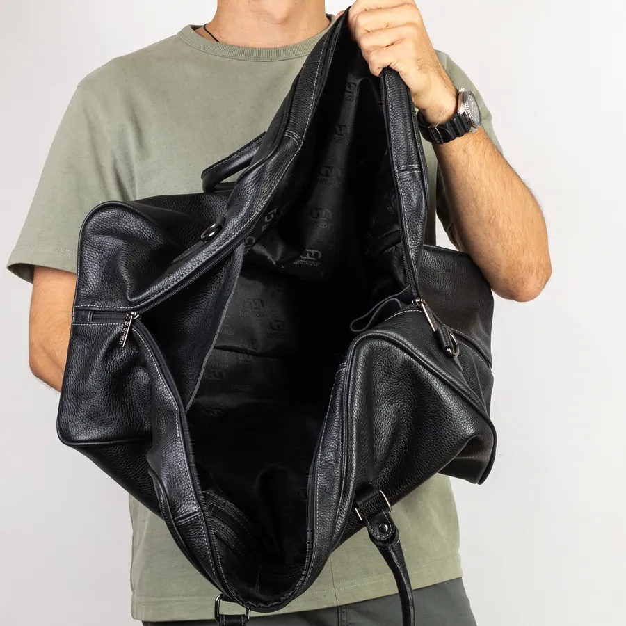 Дорожная сумка бренда Francesco Molinary из натуральной кожи с зернистой структурой. Прошита фирменной подкладочной тканью. Имеет вшитые кожаные ручки с возможностью их соединить с помощью застежки. В наличии одно большое отделение под молнией, внутри которого есть карман на молнии. В комплект входит прицепной плечевой ремень. Снизу есть металлические ножки, чтобы можно было поставить сумку на твердую поверхность