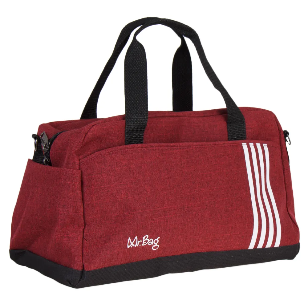 Компактная стильная спортивная сумка от бренда Mr.Bag выполнена из текстильного материала в сочетании бордового и черного цвета. Модель в форме купола, с двумя удлиненными ручками и съемным плечевым ремнем. Отделение на молнии, с текстильной подкладкой. Внутри: карман на молнии, накладной карман на молнии. На передней и задней сторонах – карман на молнии. Сбоку справа карман со скрытым кармашком на молнии. Спереди – декоративный принт с названием бренда и белыми вертикальными полосками.